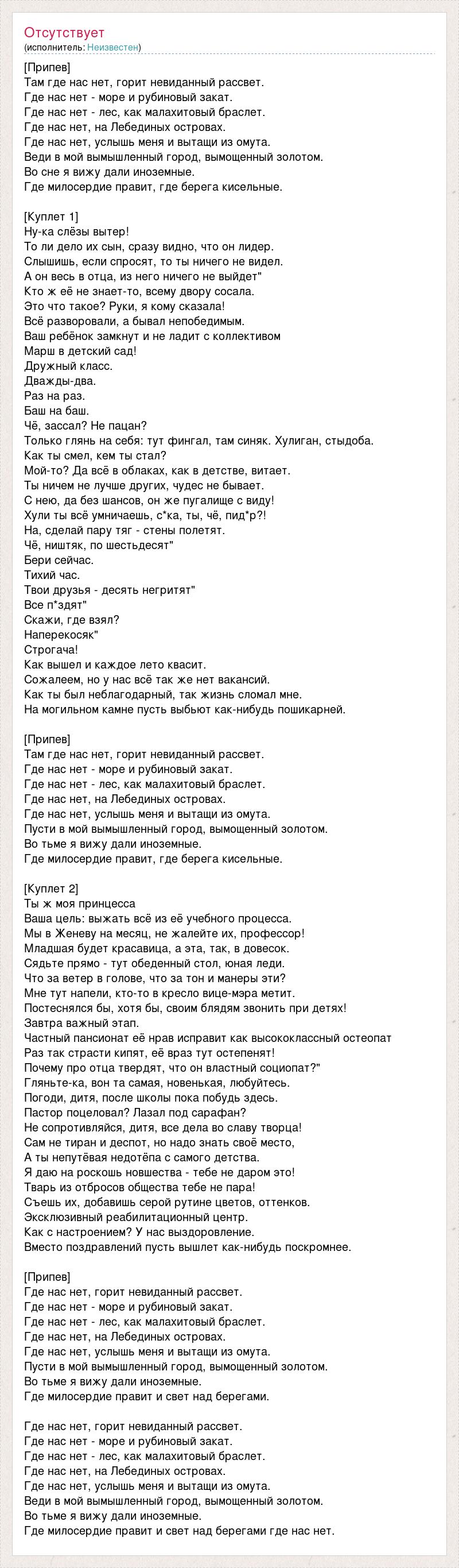 [Припев] Там где нас нет, горит невиданный рассвет. Где нас нет - море и рубиновый закат. Где нас нет - лес, как малахитовый браслет. Где нас нет, на Лебединых островах. Где нас нет, услышь меня и вытащи из омута. Веди в мой вымышленный город, вымощенный золотом. Во сне я вижу дали иноземные. Где милосердие правит, где берега кисельные. [Куплет 1] Ну-ка слёзы вытер! То ли дело их сын, сразу видно, что он лидер. Слышишь, если спросят, то ты ничего не видел. А он весь в отца, из него ничего не выйдет" Кто ж её не знает-то, всему двору сосала. Это что такое? Руки, я кому сказала! Всё разворовали, а бывал непобедимым. Ваш ребёнок замкнут и не ладит с коллективом Марш в детский сад! Дружный класс. Дважды-два. Раз на раз. Баш на баш. Чё, зассал? Не пацан? Только глянь на себя: тут фингал, там синяк. Хулиган, стыдоба. Как ты смел, кем ты стал? Мой-то? Да всё в облаках, как в детстве, витает. Ты ничем не лучше других, чудес не бывает. С нею, да без шансов, он же пугалище с виду! Хули ты всё умничаешь, с*ка, ты, чё, пид*р?! На, сделай пару тяг - стены полетят. Чё, ништяк, по шестьдесят" Бери сейчас. Тихий час. Твои друзья - десять негритят" Все п*здят" Скажи, где взял? Наперекосяк" Строгача! Как вышел и каждое лето квасит. Сожалеем, но у нас всё так же нет вакансий. Как ты был неблагодарный, так жизнь сломал мне. На могильном камне пусть выбьют как-нибудь пошикарней. [Припев] Там где нас нет, горит невиданный рассвет. Где нас нет - море и рубиновый закат. Где нас нет - лес, как малахитовый браслет. Где нас нет, на Лебединых островах. Где нас нет, услышь меня и вытащи из омута. Пусти в мой вымышленный город, вымощенный золотом. Во тьме я вижу дали иноземные. Где милосердие правит, где берега кисельные. [Куплет 2] Ты ж моя принцесса Ваша цель: выжать всё из её учебного процесса. Мы в Женеву на месяц, не жалейте их, профессор! Младшая будет красавица, а эта, так, в довесок. Сядьте прямо - тут обеденный стол, юная леди. Что за ветер в голове, что за тон и манеры эти? Мне тут напели, кто-то в кресло вице-мэра метит. Постеснялся бы, хотя бы, своим блядям звонить при детях! Завтра важный этап. Частный пансионат её нрав исправит как высококлассный остеопат Раз так страсти кипят, её враз тут остепенят! Почему про отца твердят, что он властный социопат?" Гляньте-ка, вон та самая, новенькая, любуйтесь. Погоди, дитя, после школы пока побудь здесь. Пастор поцеловал? Лазал под сарафан? Не сопротивляйся, дитя, все дела во славу творца! Сам не тиран и деспот, но надо знать своё место, А ты непутёвая недотёпа с самого детства. Я даю на роскошь новшества - тебе не даром это! Тварь из отбросов общества тебе не пара! Съешь их, добавишь серой рутине цветов, оттенков. Эксклюзивный реабилитационный центр. Как с настроением? У нас выздоровление. Вместо поздравлений пусть вышлет как-нибудь поскромнее. [Припев] Где нас нет, горит невиданный рассвет. Где нас нет - море и рубиновый закат. Где нас нет - лес, как малахитовый браслет. Где нас нет, на Лебединых островах. Где нас нет, услышь меня и вытащи из омута. Пусти в мой вымышленный город, вымощенный золотом. Во тьме я вижу дали иноземные. Где милосердие правит и свет над берегами. Где нас нет, горит невиданный рассвет. Где нас нет - море и рубиновый закат. Где нас нет - лес, как малахитовый браслет. Где нас нет, на Лебединых островах. Где нас нет, услышь меня и вытащи из омута. Веди в мой вымышленный город, вымо