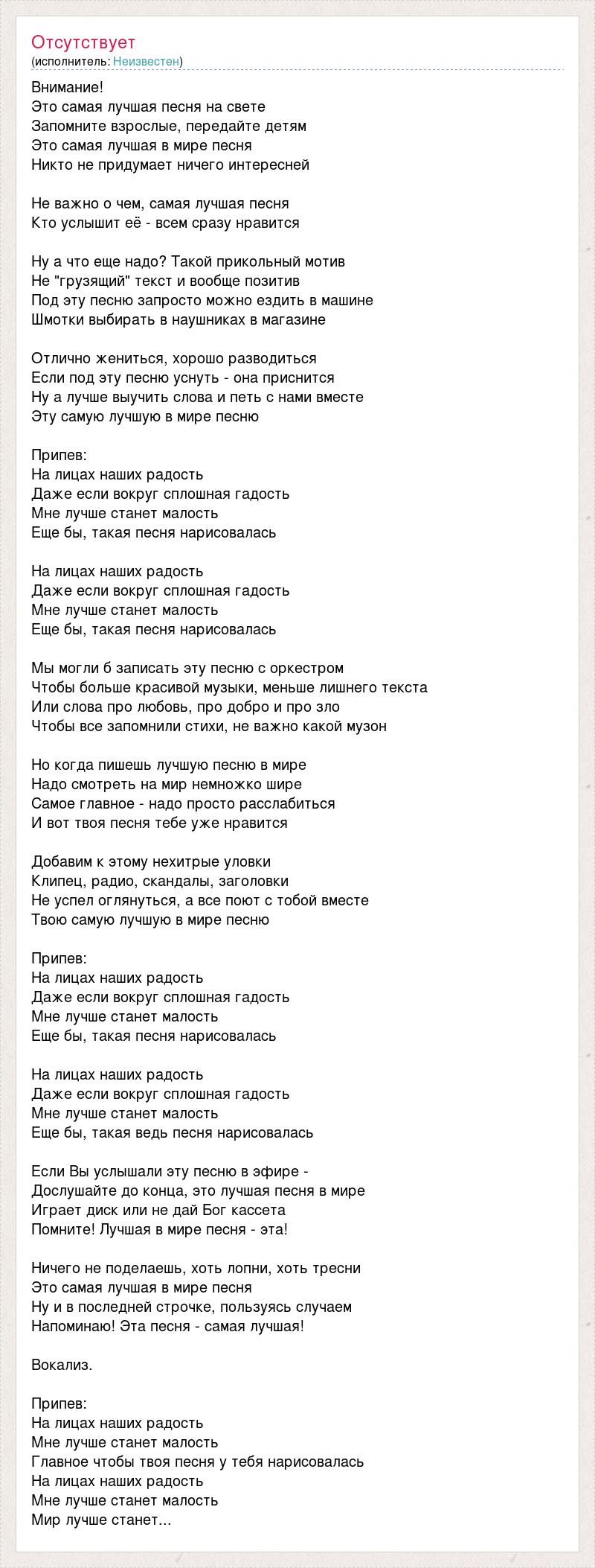 Внимание! Это самая лучшая песня на свете Запомните взрослые, передайте детям Это самая лучшая в мире песня Никто не придумает ничего интересней Не важно о чем, самая лучшая песня Кто услышит её - всем сразу нравится Ну а что еще надо? Такой прикольный мотив Не "грузящий" текст и вообще позитив Под эту песню запросто можно ездить в машине Шмотки выбирать в наушниках в магазине Отлично жениться, хорошо разводиться Если под эту песню уснуть - она приснится Ну а лучше выучить слова и петь с нами вместе Эту самую лучшую в мире песню Припев: На лицах наших радость Даже если вокруг сплошная гадость Мне лучше станет малость Еще бы, такая песня нарисовалась На лицах наших радость Даже если вокруг сплошная гадость Мне лучше станет малость Еще бы, такая песня нарисовалась Мы могли б записать эту песню с оркестром Чтобы больше красивой музыки, меньше лишнего текста Или слова про любовь, про добро и про зло Чтобы все запомнили стихи, не важно какой музон Но когда пишешь лучшую песню в мире Надо смотреть на мир немножко шире Самое главное - надо просто расслабиться И вот твоя песня тебе уже нравится Добавим к этому нехитрые уловки Клипец, радио, скандалы, заголовки Не успел оглянуться, а все поют с тобой вместе Твою самую лучшую в мире песню Припев: На лицах наших радость Даже если вокруг сплошная гадость Мне лучше станет малость Еще бы, такая песня нарисовалась На лицах наших радость Даже если вокруг сплошная гадость Мне лучше станет малость Еще бы, такая ведь песня нарисовалась Если Вы услышали эту песню в эфире - Дослушайте до конца, это лучшая песня в мире Играет диск или не дай Бог кассета Помните! Лучшая в мире песня - эта! Ничего не поделаешь, хоть лопни, хоть тресни Это самая лучшая в мире песня Ну и в последней строчке, пользуясь случаем Напоминаю! Эта песня - самая лучшая! Вокализ. Припев: На лицах наших радость Мне лучше станет малость Главное чтобы твоя песня у тебя нарисовалась На лицах наших радость Мне лучше станет малость Мир лучше станет...