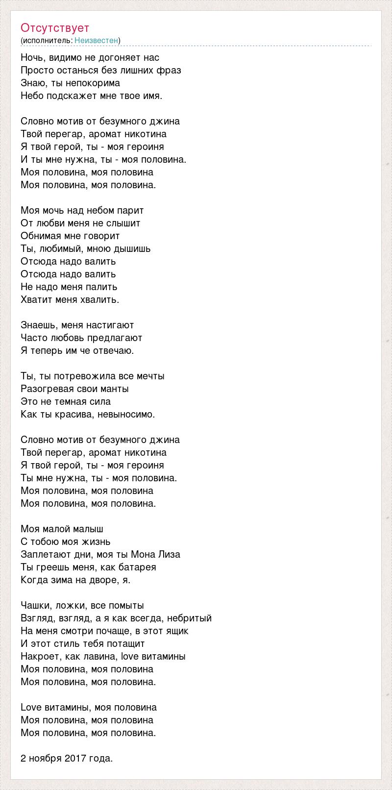 Ночь, видимо не догоняет нас Просто останься без лишних фраз Знаю, ты непокорима Небо подскажет мне твое имя. Словно мотив от безумного джина Твой перегар, аромат никотина Я твой герой, ты - моя героиня И ты мне нужна, ты - моя половина. Моя половина, моя половина Моя половина, моя половина. Моя мочь над небом парит От любви меня не слышит Обнимая мне говорит Ты, любимый, мною дышишь Отсюда надо валить Отсюда надо валить Не надо меня палить Хватит меня хвалить. Знаешь, меня настигают Часто любовь предлагают Я теперь им че отвечаю. Ты, ты потревожила все мечты Разогревая свои манты Это не темная сила Как ты красива, невыносимо. Словно мотив от безумного джина Твой перегар, аромат никотина Я твой герой, ты - моя героиня Ты мне нужна, ты - моя половина. Моя половина, моя половина Моя половина, моя половина. Моя малой малыш С тобою моя жизнь Заплетают дни, моя ты Мона Лиза Ты греешь меня, как батарея Когда зима на дворе, я. Чашки, ложки, все помыты Взгляд, взгляд, а я как всегда, небритый На меня смотри почаще, в этот ящик И этот стиль тебя потащит Накроет, как лавина, love витамины Моя половина, моя половина Моя половина, моя половина. Love витамины, моя половина Моя половина, моя половина Моя половина, моя половина. 2 ноября 2017 года.