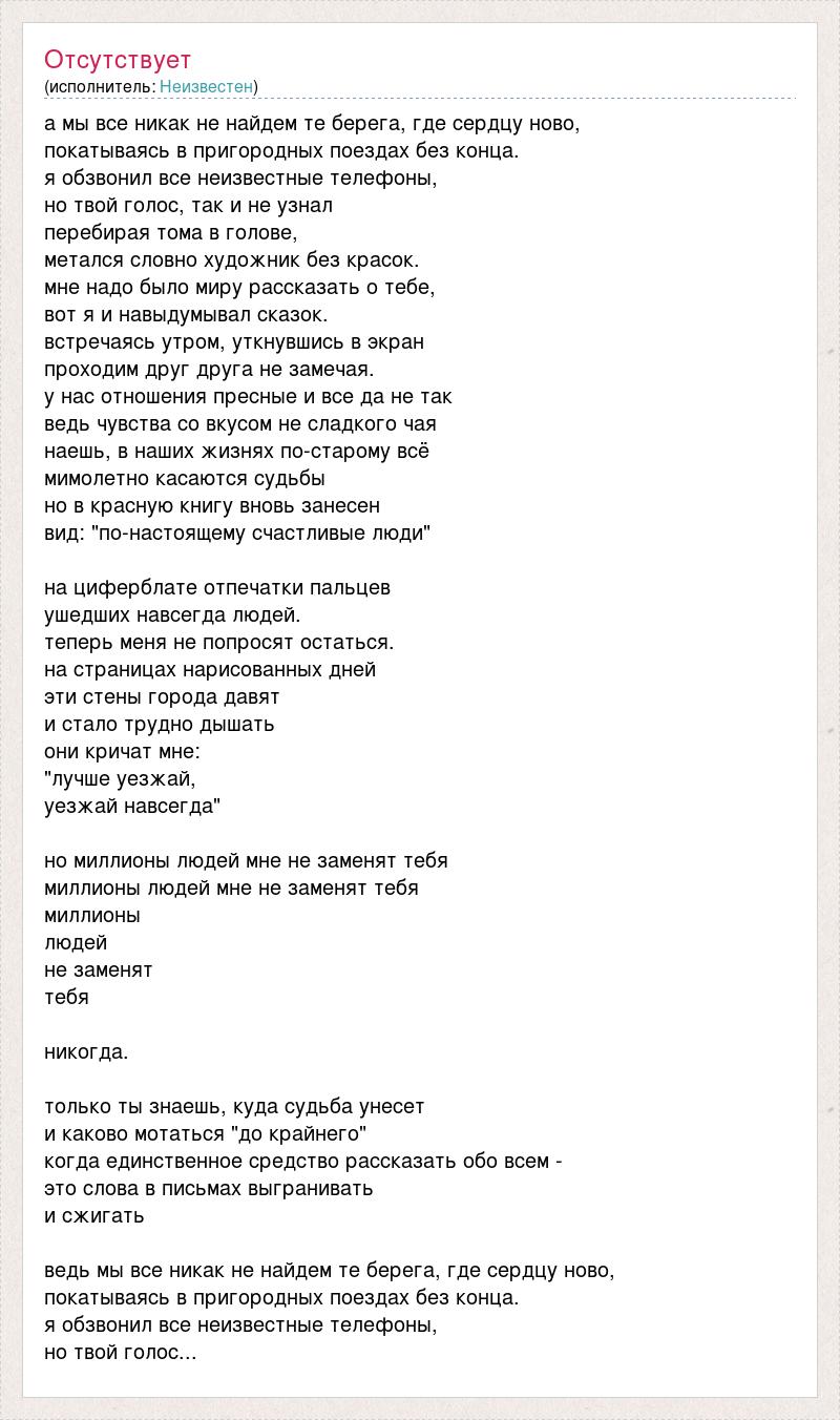 а мы все никак не найдем те берега, где сердцу ново, покатываясь в пригородных поездах без конца. я обзвонил все неизвестные телефоны, но твой голос, так и не узнал перебирая тома в голове, метался словно художник без красок. мне надо было миру рассказать о тебе, вот я и навыдумывал сказок. встречаясь утром, уткнувшись в экран проходим друг друга не замечая. у нас отношения пресные и все да не так ведь чувства со вкусом не сладкого чая наешь, в наших жизнях по-старому всё мимолетно касаются судьбы но в красную книгу вновь занесен вид: "по-настоящему счастливые люди" на циферблате отпечатки пальцев ушедших навсегда людей. теперь меня не попросят остаться. на страницах нарисованных дней эти стены города давят и стало трудно дышать они кричат мне: "лучше уезжай, уезжай навсегда" но миллионы людей мне не заменят тебя миллионы людей мне не заменят тебя миллионы людей не заменят тебя никогда. только ты знаешь, куда судьба унесет и каково мотаться "до крайнего" когда единственное средство рассказать обо всем - это слова в письмах выгранивать и сжигать ведь мы все никак не найдем те берега, где сердцу ново, покатываясь в пригородных поездах без конца. я обзвонил все неизвестные телефоны, но твой голос...