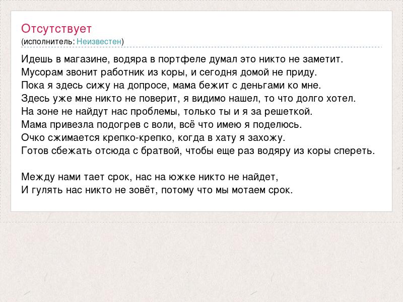 Идешь в магазине, водяра в портфеле думал это никто не заметит. Мусорам звонит работник из коры, и сегодня домой не приду. Пока я здесь сижу на допросе, мама бежит с деньгами ко мне. Здесь уже мне никто не поверит, я видимо нашел, то что долго хотел. На зоне не найдут нас проблемы, только ты и я за решеткой. Мама привезла подогрев с воли, всё что имею я поделюсь. Очко сжимается крепко-крепко, когда в хату я захожу. Готов сбежать отсюда с братвой, чтобы еще раз водяру из коры спереть. Между нами тает срок, нас на южке никто не найдет, И гулять нас никто не зовёт, потому что мы мотаем срок.