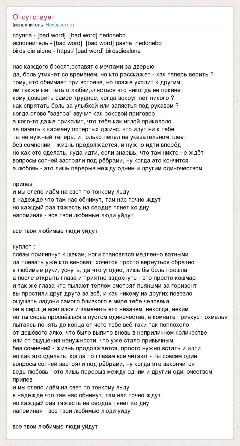 группа - [bad word] [bad word] nedonebo исполнитель - [bad word] [bad word] pasha_nedonebo birds die alone - https:/ [bad word] birdsdiealone ______________________________________ нас каждого бросят,оставят с мечтами за дверью да, боль утихнет со временем, но кто расскажет - как теперь верить ? тому, кто обнимает при встрече, но позже уходит к другим им также шептать о любви,клясться что никогда не покинет кому доверить самое трудное, когда вокруг нет никого ? как спрятать боль за улыбкой или запястья под рукавом ? когда слово "завтра" звучит как роковой приговор а кого-то даже приколит, что тебя как иглой прикололо за память к карману потёртых джинс, что идут ни к тебе ты не нужный теперь, и только пепел на указательном тлеет без сомнений - жизнь продолжается, и нужно идти вперёд но как это сделать, куда идти, если знаешь, что там никто не ждёт вопросы сотней застряли под рёбрами, ну когда это кончится а любовь - это лишь перерыв между одним и другим одиночеством припев и мы слепо идём на свет по тонкому льду в надежде что там нас обнимут, там нас точно ждут но каждый раз тяжесть на сердце тянет ко дну напоминая - все твои любимые люди уйдут все твои любимые люди уйдут куплет : слёзы прилипнут к щекам, ноги становятся медленно ватными да плевать уже кто виноват, хочется просто вернуться обратно в любимые руки, уснуть, да что угодно, лишь бы боль прошла а после открыть глаза и приятно вздохнуть - это просто кошмар и так же глаза что пылают теплом смотрят пьяными за горизонт вы простили друг друга за всё, и как никому из других повезло ощущать ладони самого близкого в мире тебе человека он в сердце вселился и заменить его незачем, некогда, неким но ты снова проснёшься в пустом одиночестве, в комнате привкус похмелья пытаясь понять до конца от чего тебе всё таки так поплохело от дешёвого алко, что было выпито вновь в неприличном количестве или от ощущения ненужности, что уже стало привычным без сомнений - жизнь продолжается, просто нужно встать и идти но как это сделать, когда по глазам все читают - ты совсем один вопросы сотней застряли под рёбрами, ну когда это закончится ведь любовь - это лишь перерыв между одним и другим одиночеством припев и мы слепо идём на свет по тонкому льду в надежде что там нас обнимут, там нас точно ждут но каждый раз тяжесть на сердце тянет ко дну напоминая - все твои любимые люди уйдут все твои любимые люди уйдут