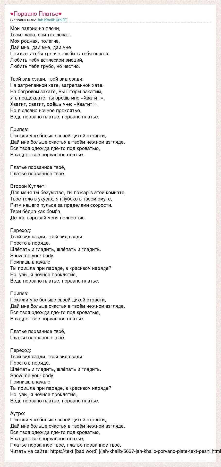 Мои ладони на плечи, Твои глаза, они так лечат. Моя родная, полегче, Дай мне, дай мне, дай мне Прижать тебя крепче, любить тебя нежно, Любить тебя всплеском эмоций, Любить тебя грубо, но честно. Твой вид сзади, твой вид сзади, На затрепанной хате, затрепанной хате. На багровом закате, мы шторы закатим, Я в неадеквате, ты орёшь мне «Хватит!», Хватит, хватит, орёшь мне: «Хватит!». Но я словно ночное проклятье, Ведь порвано платье, порвано платье. Припев: Покажи мне больше своей дикой страсти, Дай мне больше счастья в твоём нежном взгляде. Вся твоя одежда где-то под кроватью, В кадре твоё порванное платье. Платье порванное твоё, Платье порванное твоё. Второй Куплет: Для меня ты безумство, ты пожар в этой комнате, Твоё тело в укусах, я глубоко в твоём омуте, Ритм нашего пульса за пределами скорости. Твои бёдра как бомба, Детка, взрывай меня полностью. Переход: Твой вид сзади, твой вид сзади Просто в поряде. Шлёпать и гладить, шлёпать и гладить. Show me your body. Помнишь вначале Ты пришла при параде, в красивом наряде? Но, увы, я ночное проклятие, Ведь порвано платье, порвано платье. Припев: Покажи мне больше своей дикой страсти, Дай мне больше счастья в твоём нежном взгляде. Вся твоя одежда где-то под кроватью, В кадре твоё порванное платье. Платье порванное твоё, Платье порванное твоё. Переход: Твой вид сзади, твой вид сзади Просто в поряде. Шлёпать и гладить, шлёпать и гладить. Show me your body. Помнишь вначале Ты пришла при параде, в красивом наряде? Но, увы, я ночное проклятие, Ведь порвано платье, порвано платье. Аутро: Покажи мне больше своей дикой страсти, Дай мне больше счастья в твоём нежном взгляде, Вся твоя одежда где-то под кроватью, В кадре твоё порванное платье, Платье порванное твоё, платье порванное твоё. Читать на сайте: https://text [bad word] j/jah-khalib/5637-jah-khalib-porvano-plate-text-pesni.html