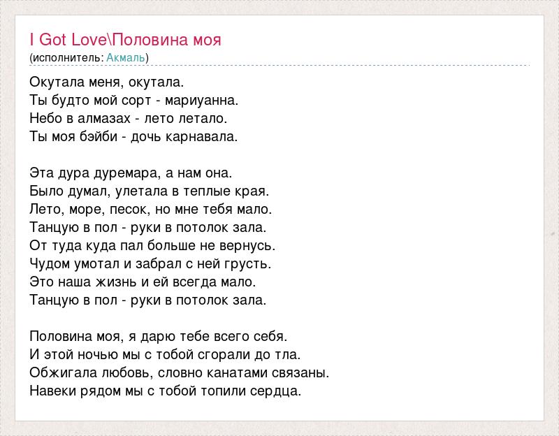 Окутала меня, окутала. Ты будто мой сорт - мариуанна. Небо в алмазах - лето летало. Ты моя бэйби - дочь карнавала. Эта дура дуремара, а нам она. Было думал, улетала в теплые края. Лето, море, песок, но мне тебя мало. Танцую в пол - руки в потолок зала. От туда куда пал больше не вернусь. Чудом умотал и забрал с ней грусть. Это наша жизнь и ей всегда мало. Танцую в пол - руки в потолок зала. Половина моя, я дарю тебе всего себя. И этой ночью мы с тобой сгорали до тла. Обжигала любовь, словно канатами связаны. Навеки рядом мы с тобой топили сердца.