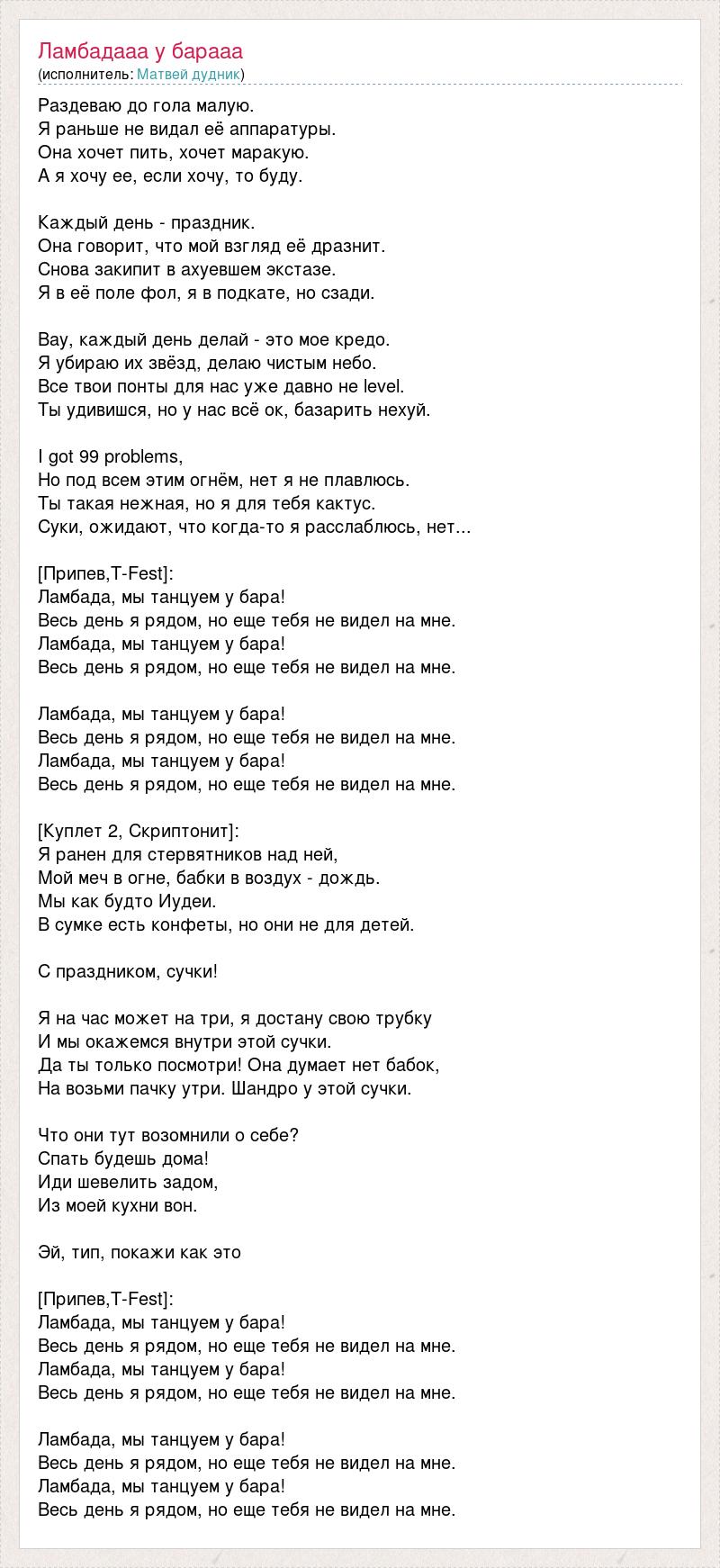 Раздеваю до гола малую. Я раньше не видал её аппаратуры. Она хочет пить, хочет маракую. А я хочу ее, если хочу, то буду. Каждый день - праздник. Она говорит, что мой взгляд её дразнит. Снова закипит в ахуевшем экстазе. Я в её поле фол, я в подкате, но сзади. Вау, каждый день делай - это мое кредо. Я убираю их звёзд, делаю чистым небо. Все твои понты для нас уже давно не level. Ты удивишся, но у нас всё ок, базарить нехуй. I got 99 problems, Но под всем этим огнём, нет я не плавлюсь. Ты такая нежная, но я для тебя кактус. Суки, ожидают, что когда-то я расслаблюсь, нет... [Припев,T-Fest]: Ламбада, мы танцуем у бара! Весь день я рядом, но еще тебя не видел на мне. Ламбада, мы танцуем у бара! Весь день я рядом, но еще тебя не видел на мне. Ламбада, мы танцуем у бара! Весь день я рядом, но еще тебя не видел на мне. Ламбада, мы танцуем у бара! Весь день я рядом, но еще тебя не видел на мне. [Куплет 2, Скриптонит]: Я ранен для стервятников над ней, Мой меч в огне, бабки в воздух - дождь. Мы как будто Иудеи. В сумке есть конфеты, но они не для детей. С праздником, сучки! Я на час может на три, я достану свою трубку И мы окажемся внутри этой сучки. Да ты только посмотри! Она думает нет бабок, На возьми пачку утри. Шандро у этой сучки. Что они тут возомнили о себе? Спать будешь дома! Иди шевелить задом, Из моей кухни вон. Эй, тип, покажи как это [Припев,T-Fest]: Ламбада, мы танцуем у бара! Весь день я рядом, но еще тебя не видел на мне. Ламбада, мы танцуем у бара! Весь день я рядом, но еще тебя не видел на мне. Ламбада, мы танцуем у бара! Весь день я рядом, но еще тебя не видел на мне. Ламбада, мы танцуем у бара! Весь день я рядом, но еще тебя не видел на мне.