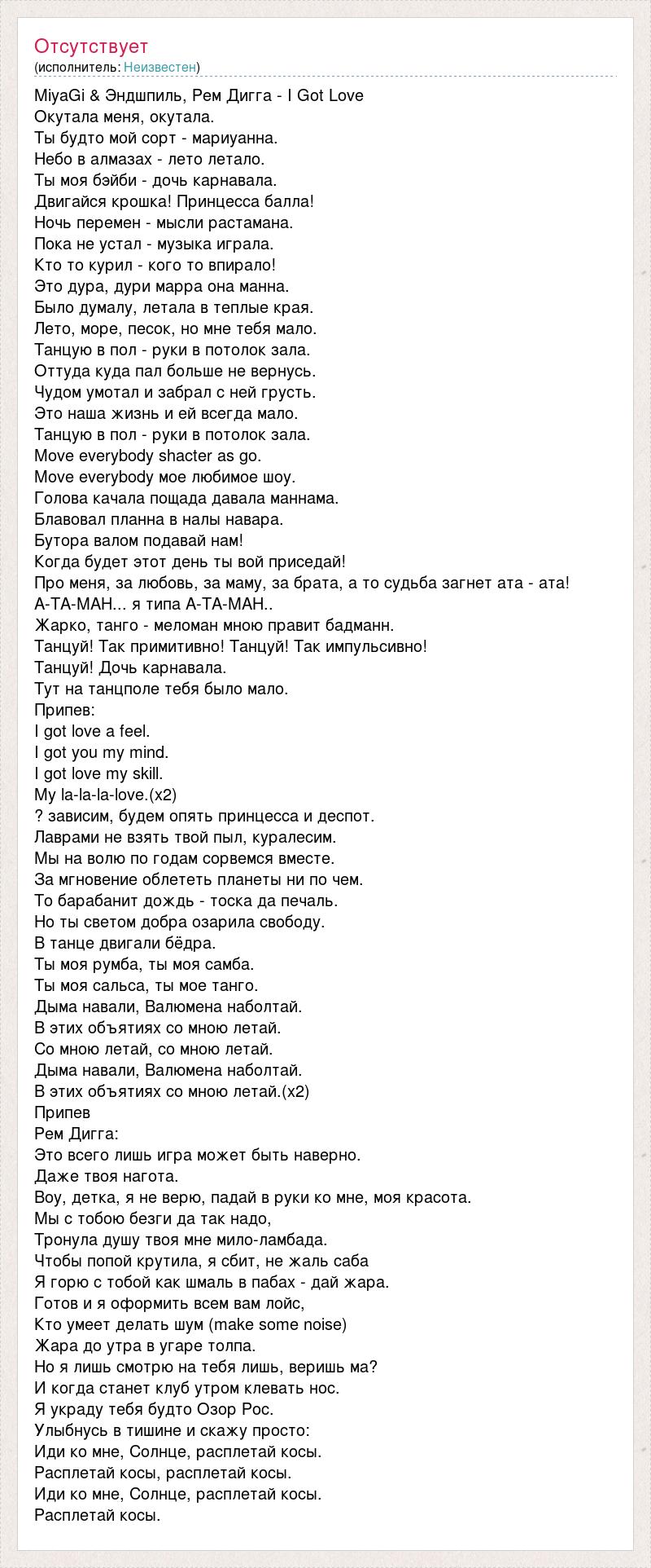 MiyaGi & Эндшпиль, Рем Дигга - I Got Love Окутала меня, окутала. Ты будто мой сорт - мариуанна. Небо в алмазах - лето летало. Ты моя бэйби - дочь карнавала. Двигайся крошка! Принцесса балла! Ночь перемен - мысли растамана. Пока не устал - музыка играла. Кто то курил - кого то впирало! Это дура, дури марра она манна. Было думалу, летала в теплые края. Лето, море, песок, но мне тебя мало. Танцую в пол - руки в потолок зала. Оттуда куда пал больше не вернусь. Чудом умотал и забрал с ней грусть. Это наша жизнь и ей всегда мало. Танцую в пол - руки в потолок зала. Move everybody shacter as go. Move everybody мое любимое шоу. Голова качала пощада давала маннама. Блавовал планна в налы навара. Бутора валом подавай нам! Когда будет этот день ты вой приседай! Про меня, за любовь, за маму, за брата, а то судьба загнет ата - ата! А-ТА-МАН... я типа А-ТА-МАН.. Жарко, танго - меломан мною правит бадманн. Танцуй! Так примитивно! Танцуй! Так импульсивно! Танцуй! Дочь карнавала. Тут на танцполе тебя было мало. Припев: I got love а feel. I got you my mind. I got love my skill. My la-la-la-love.(х2) ? зависим, будем опять принцесса и деспот. Лаврами не взять твой пыл, куралесим. Мы на волю по годам сорвемся вместе. За мгновение облететь планеты ни по чем. То барабанит дождь - тоска да печаль. Но ты светом добра озарила свободу. В танце двигали бёдра. Ты моя румба, ты моя самба. Ты моя сальса, ты мое танго. Дыма навали, Валюмена наболтай. В этих объятиях со мною летай. Со мною летай, со мною летай. Дыма навали, Валюмена наболтай. В этих объятиях со мною летай.(х2) Припев Рем Дигга: Это всего лишь игра может быть наверно. Даже твоя нагота. Воу, детка, я не верю, падай в руки ко мне, моя красота. Мы с тобою безги да так надо, Тронула душу твоя мне мило-ламбада. Чтобы попой крутила, я сбит, не жаль саба Я горю с тобой как шмаль в пабах - дай жара. Готов и я оформить всем вам лойс, Кто умеет делать шум (make some noise) Жара до утра в угаре толпа. Но я лишь смотрю на тебя лишь, веришь ма? И когда станет клуб утром клевать нос. Я украду тебя будто Озор Рос. Улыбнусь в тишине и скажу просто: Иди ко мне, Солнце, расплетай косы. Расплетай косы, расплетай косы. Иди ко мне, Солнце, расплетай косы. Расплетай косы.