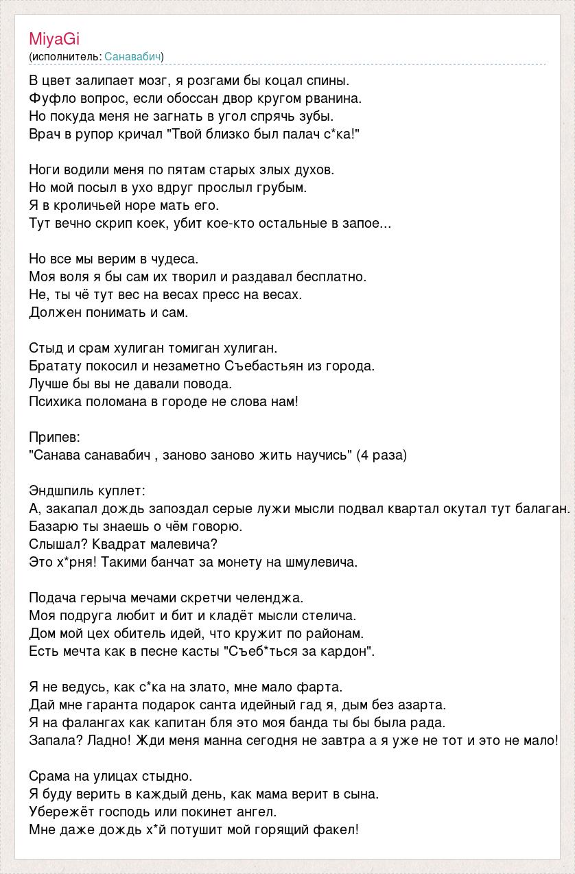 В цвет залипает мозг, я розгами бы коцал спины. Фуфло вопрос, если обоссан двор кругом рванина. Но покуда меня не загнать в угол спрячь зубы. Врач в рупор кричал "Твой близко был палач с*ка!" Ноги водили меня по пятам старых злых духов. Но мой посыл в ухо вдруг прослыл грубым. Я в кроличьей норе мать его. Тут вечно скрип коек, убит кое-кто остальные в запое... Но все мы верим в чудеса. Моя воля я бы сам их творил и раздавал бесплатно. Не, ты чё тут вес на весах пресс на весах. Должен понимать и сам. Стыд и срам хулиган томиган хулиган. Братату покосил и незаметно Съебастьян из города. Лучше бы вы не давали повода. Психика поломана в городе не слова нам! Припев: "Санава санавабич , заново заново жить научись" (4 раза) Эндшпиль куплет: А, закапал дождь запоздал серые лужи мысли подвал квартал окутал тут балаган. Базарю ты знаешь о чём говорю. Слышал? Квадрат малевича? Это х*рня! Такими банчат за монету на шмулевича. Подача герыча мечами скретчи челенджа. Моя подруга любит и бит и кладёт мысли стелича. Дом мой цех обитель идей, что кружит по районам. Есть мечта как в песне касты "Съеб*ться за кардон". Я не ведусь, как с*ка на злато, мне мало фарта. Дай мне гаранта подарок санта идейный гад я, дым без азарта. Я на фалангах как капитан бля это моя банда ты бы была рада. Запала? Ладно! Жди меня манна сегодня не завтра а я уже не тот и это не мало! Срама на улицах стыдно. Я буду верить в каждый день, как мама верит в сына. Убережёт господь или покинет ангел. Мне даже дождь х*й потушит мой горящий факел!
