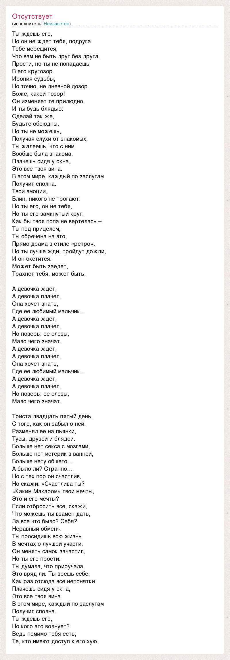 Ты ждешь его, Но он не ждет тебя, подруга. Тебе мерещится, Что вам не быть друг без друга. Прости, но ты не попадаешь В его кругозор. Ирония судьбы, Но точно, не дневной дозор. Боже, какой позор! Он изменяет те прилюдно. И ты будь блядью: Сделай так же, Будьте обоюдны. Но ты не можешь, Получая слухи от знакомых, Ты жалеешь, что с ним Вообще была знакома. Плачешь сидя у окна, Это все твоя вина. В этом мире, каждый по заслугам Получит сполна. Твои эмоции, Блин, никого не трогают. Но ты его, он не тебя, Но ты его замкнутый круг. Как бы твоя попа не вертелась – Ты под прицелом, Ты обречена на это, Прямо драма в стиле «ретро». Но ты лучше жди, пройдут дожди, И он окстится. Может быть заедет, Трахнет тебя, может быть. А девочка ждет, А девочка плачет, Она хочет знать, Где ее любимый мальчик… А девочка ждет, А девочка плачет, Но поверь: ее слезы, Мало чего значат. А девочка ждет, А девочка плачет, Она хочет знать, Где ее любимый мальчик… А девочка ждет, А девочка плачет, Но поверь: ее слезы, Мало чего значат. Триста двадцать пятый день, С того, как он забыл о ней. Разменял ее на пьянки, Тусы, друзей и блядей. Больше нет секса с мозгами, Больше нет истерик в ванной, Больше нету общего… А было ли? Странно… Но с тех пор он счастлив, Но скажи: «Счастлива ты? «Каким Макаром» твои мечты, Это и его мечты? Если отбросить все, скажи, Что можешь ты взамен дать, За все что было? Себя? Неравный обмен». Ты просидишь всю жизнь В мечтах о лучшей участи. Он менять самок зачастил, Но ты его прости. Ты думала, что приручала. Это вряд ли. Ты врешь себе, Как раз отсюда все непонятки. Плачешь сидя у окна, Это все твоя вина. В этом мире, каждый по заслугам Получит сполна. Ты ждешь его, Но кого это волнует? Ведь помимо тебя есть, Те, кто имеют доступ к его хую.