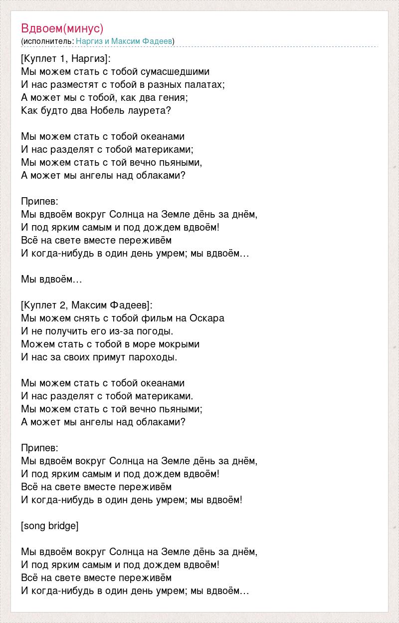 [Куплет 1, Наргиз]: Мы можем стать с тобой сумасшедшими И нас разместят с тобой в разных палатах; А может мы с тобой, как два гения; Как будто два Нобель лаурета? Мы можем стать с тобой океанами И нас разделят с тобой материками; Мы можем стать с той вечно пьяными, А может мы ангелы над облаками? Припев: Мы вдвоём вокруг Солнца на Земле дёнь за днём, И под ярким самым и под дождем вдвоём! Всё на свете вместе переживём И когда-нибудь в один день умрем; мы вдвоём… Мы вдвоём… [Куплет 2, Максим Фадеев]: Мы можем снять с тобой фильм на Оскара И не получить его из-за погоды. Можем стать с тобой в море мокрыми И нас за своих примут пароходы. Мы можем стать с тобой океанами И нас разделят с тобой материками. Мы можем стать с той вечно пьяными; А может мы ангелы над облаками? Припев: Мы вдвоём вокруг Солнца на Земле дёнь за днём, И под ярким самым и под дождем вдвоём! Всё на свете вместе переживём И когда-нибудь в один день умрем; мы вдвоём! [song bridge] Мы вдвоём вокруг Солнца на Земле дёнь за днём, И под ярким самым и под дождем вдвоём! Всё на свете вместе переживём И когда-нибудь в один день умрем; мы вдвоём…