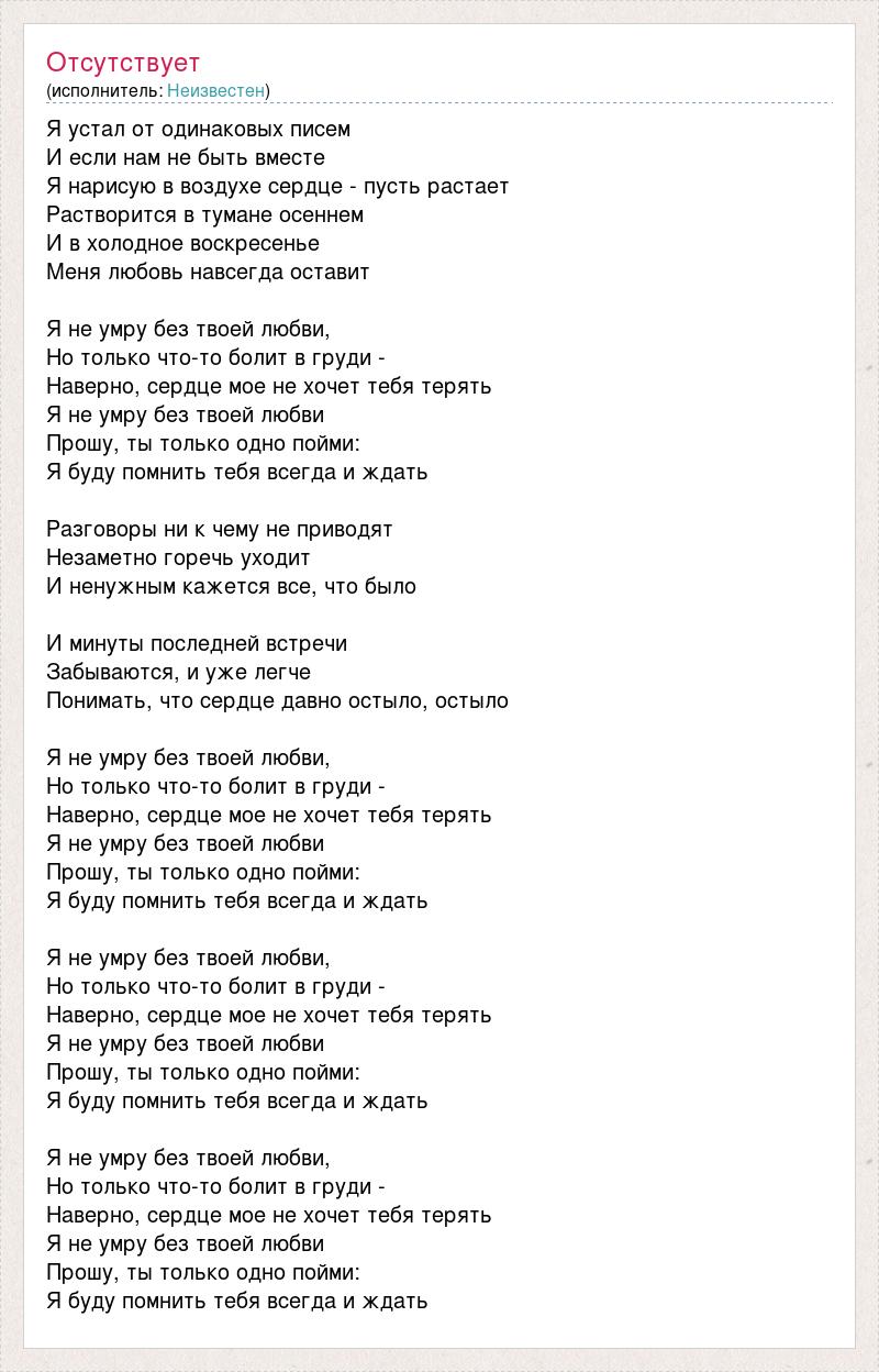 Я устал от одинаковых писем И если нам не быть вместе Я нарисую в воздухе сердце - пусть растает Растворится в тумане осеннем И в холодное воскресенье Меня любовь навсегда оставит Я не умру без твоей любви, Но только что-то болит в груди - Наверно, сердце мое не хочет тебя терять Я не умру без твоей любви Прошу, ты только одно пойми: Я буду помнить тебя всегда и ждать Разговоры ни к чему не приводят Незаметно горечь уходит И ненужным кажется все, что было И минуты последней встречи Забываются, и уже легче Понимать, что сердце давно остыло, остыло Я не умру без твоей любви, Но только что-то болит в груди - Наверно, сердце мое не хочет тебя терять Я не умру без твоей любви Прошу, ты только одно пойми: Я буду помнить тебя всегда и ждать Я не умру без твоей любви, Но только что-то болит в груди - Наверно, сердце мое не хочет тебя терять Я не умру без твоей любви Прошу, ты только одно пойми: Я буду помнить тебя всегда и ждать Я не умру без твоей любви, Но только что-то болит в груди - Наверно, сердце мое не хочет тебя терять Я не умру без твоей любви Прошу, ты только одно пойми: Я буду помнить тебя всегда и ждать