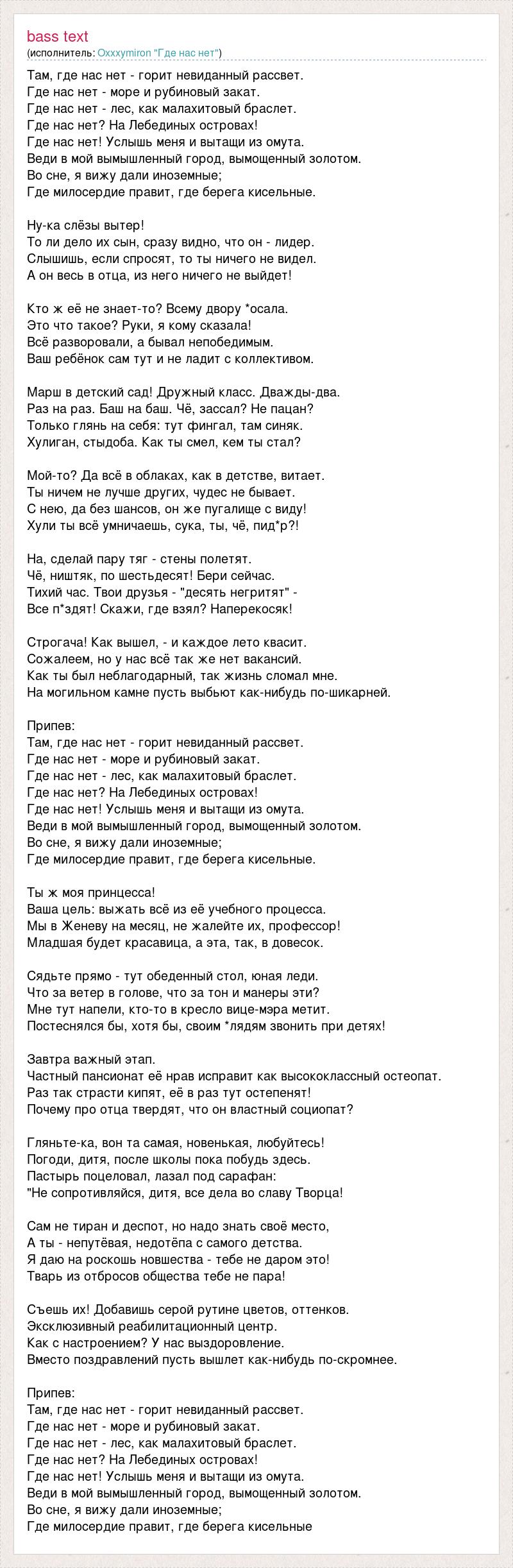 Там, где нас нет - горит невиданный рассвет. Где нас нет - море и рубиновый закат. Где нас нет - лес, как малахитовый браслет. Где нас нет? На Лебединых островах! Где нас нет! Услышь меня и вытащи из омута. Веди в мой вымышленный город, вымощенный золотом. Во сне, я вижу дали иноземные; Где милосердие правит, где берега кисельные. Ну-ка слёзы вытер! То ли дело их сын, сразу видно, что он - лидер. Слышишь, если спросят, то ты ничего не видел. А он весь в отца, из него ничего не выйдет! Кто ж её не знает-то? Всему двору *осала. Это что такое? Руки, я кому сказала! Всё разворовали, а бывал непобедимым. Ваш ребёнок сам тут и не ладит с коллективом. Марш в детский сад! Дружный класс. Дважды-два. Раз на раз. Баш на баш. Чё, зассал? Не пацан? Только глянь на себя: тут фингал, там синяк. Хулиган, стыдоба. Как ты смел, кем ты стал? Мой-то? Да всё в облаках, как в детстве, витает. Ты ничем не лучше других, чудес не бывает. С нею, да без шансов, он же пугалище с виду! Хули ты всё умничаешь, сука, ты, чё, пид*р?! На, сделай пару тяг - стены полетят. Чё, ништяк, по шестьдесят! Бери сейчас. Тихий час. Твои друзья - "десять негритят" - Все п*здят! Скажи, где взял? Наперекосяк! Строгача! Как вышел, - и каждое лето квасит. Сожалеем, но у нас всё так же нет вакансий. Как ты был неблагодарный, так жизнь сломал мне. На могильном камне пусть выбьют как-нибудь по-шикарней. Припев: Там, где нас нет - горит невиданный рассвет. Где нас нет - море и рубиновый закат. Где нас нет - лес, как малахитовый браслет. Где нас нет? На Лебединых островах! Где нас нет! Услышь меня и вытащи из омута. Веди в мой вымышленный город, вымощенный золотом. Во сне, я вижу дали иноземные; Где милосердие правит, где берега кисельные. Ты ж моя принцесса! Ваша цель: выжать всё из её учебного процесса. Мы в Женеву на месяц, не жалейте их, профессор! Младшая будет красавица, а эта, так, в довесок. Сядьте прямо - тут обеденный стол, юная леди. Что за ветер в голове, что за тон и манеры эти? Мне тут напели, кто-то в кресло вице-мэра метит. Постеснялся бы, хотя бы, своим *лядям звонить при детях! Завтра важный этап. Частный пансионат её нрав исправит как высококлассный остеопат. Раз так страсти кипят, её в раз тут остепенят! Почему про отца твердят, что он властный социопат? Гляньте-ка, вон та самая, новенькая, любуйтесь! Погоди, дитя, после школы пока побудь здесь. Пастырь поцеловал, лазал под сарафан: "Не сопротивляйся, дитя, все дела во славу Творца! Сам не тиран и деспот, но надо знать своё место, А ты - непутёвая, недотёпа с самого детства. Я даю на роскошь новшества - тебе не даром это! Тварь из отбросов общества тебе не пара! Съешь их! Добавишь серой рутине цветов, оттенков. Эксклюзивный реабилитационный центр. Как с настроением? У нас выздоровление. Вместо поздравлений пусть вышлет как-нибудь по-скромнее. Припев: Там, где нас нет - горит невиданный рассвет. Где нас нет - море и рубиновый закат. Где нас нет - лес, как малахитовый браслет. Где нас нет? На Лебединых островах! Где нас нет! Услышь меня и вытащи из омута. Веди в мой вымышленный город, вымощенный золотом. Во сне, я вижу дали иноземные; Где милосердие правит, где берега кисельные
