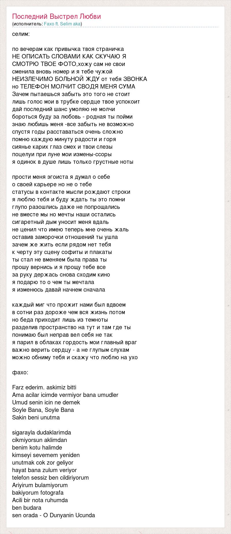 селим: по вечерам как привычка твоя страничка НЕ ОПИСАТЬ СЛОВАМИ КАК СКУЧАЮ Я СМОТРЮ ТВОЕ ФОТО,хожу сам не свои сменила вновь номер и я тебе чужой НЕИЗЛЕЧИМО БОЛЬНОЙ ЖДУ от тебя ЗВОНКА но ТЕЛЕФОН МОЛЧИТ СВОДЯ МЕНЯ СУМА Зачем пытаешься забыть это того не стоит лишь голос мои в трубке сердце твое успокоит дай последний шанс умоляю не молчи бороться буду за любовь - родная ты пойми знаю любишь меня -все забыть не возможно спустя годы расставаться очень сложно помню каждую минуту радости и горя сиянье карих глаз смех и твои слезы поцелуи при луне мои измены-ссоры я одинок в душе лишь только грустные ноты прости меня эгоиста я думал о себе о своей карьере но не о тебе статусы в контакте мысли рождают строки я люблю тебя и буду ждать ты это помни глупо разошлись даже не попрощались не вместе мы но мечты наши остались сигаретный дым уносит меня вдаль не ценил что имею теперь мне очень жаль оставив заморочки отношений ты ушла зачем же жить если рядом нет тебя к черту эту сцену софиты и плакаты ты стал не вменяем была права ты прошу вернись и я прощу тебе все за руку держась снова сходим кино я подарю то о чем ты мечтала я изменюсь давай начнем сначала каждый миг что прожит нами был вдвоем в сотни раз дороже чем вся жизнь потом но беда приходит лишь из темноты разделив пространство на тут и там где ты понимаю был неправ вел себя не так я парил в облаках гордость мои главный враг важно верить сердцу - а не глупым слухам можно обниму тебя и скажу что люблю на ухо фахо: Farz ederim. askimiz bitti Ama acilar icimde vermiyor bana umudler Umud senin icin ne demek Soyle Bana, Soyle Bana Sakin beni unutma sigarayla dudaklarimda cikmiyorsun aklimdan benim kotu halimde kimseyi sevemem yeniden unutmak cok zor geliyor hayat bana zulum veriyor telefon sessiz ben cildiriyorum Ariyirum bulamiyorum bakiyorum fotografa Acili bir nota ruhumda ben budara sen orada - O Dunyanin Ucunda