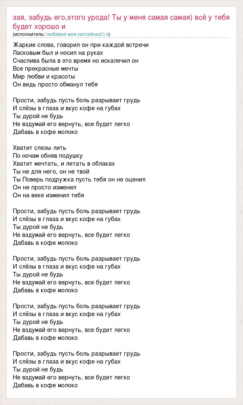 Жаркие слова, говорил он при каждой встречи Ласковым был и носил на руках Счаслива была в это время но искалечил он Все прекрасные мечты Мир любви и красоты Он ведь просто обманул тебя Прости, забудь пусть боль разрывает грудь И слёзы в глаза и вкус кофе на губах Ты дурой не будь Не вздумай его вернуть, все будет легко Дабавь в кофе молоко Хватит слезы лить По ночам обняв подушку Хватит мечтать, и летать в облаках Ты не для него, он не твой Ты Поверь подружка пусть тебя он не оценил Он не просто изменил Он на веке изменил тебя Прости, забудь пусть боль разрывает грудь И слёзы в глаза и вкус кофе на губах Ты дурой не будь Не вздумай его вернуть, все будет легко Дабавь в кофе молоко Прости, забудь пусть боль разрывает грудь И слёзы в глаза и вкус кофе на губах Ты дурой не будь Не вздумай его вернуть, все будет легко Дабавь в кофе молоко Прости, забудь пусть боль разрывает грудь И слёзы в глаза и вкус кофе на губах Ты дурой не будь Не вздумай его вернуть, все будет легко Дабавь в кофе молоко Прости, забудь пусть боль разрывает грудь И слёзы в глаза и вкус кофе на губах Ты дурой не будь Не вздумай его вернуть, все будет легко Дабавь в кофе молоко