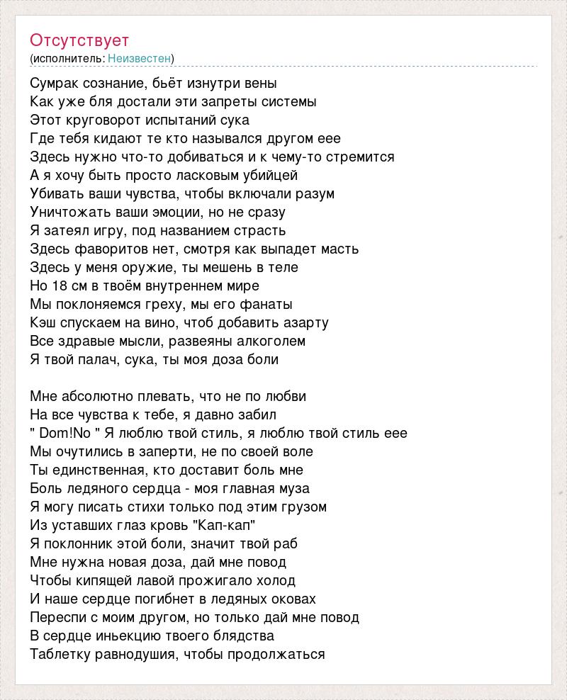 Сумрак сознание, бьёт изнутри вены Как уже бля достали эти запреты системы Этот круговорот испытаний сука Где тебя кидают те кто назывался другом еее Здесь нужно что-то добиваться и к чему-то стремится А я хочу быть просто ласковым убийцей Убивать ваши чувства, чтобы включали разум Уничтожать ваши эмоции, но не сразу Я затеял игру, под названием страсть Здесь фаворитов нет, смотря как выпадет масть Здесь у меня оружие, ты мешень в теле Но 18 см в твоём внутреннем мире Мы поклоняемся греху, мы его фанаты Кэш спускаем на вино, чтоб добавить азарту Все здравые мысли, развеяны алкоголем Я твой палач, сука, ты моя доза боли Мне абсолютно плевать, что не по любви На все чувства к тебе, я давно забил " Dom!No " Я люблю твой стиль, я люблю твой стиль еее Мы очутились в заперти, не по своей воле Ты единственная, кто доставит боль мне Боль ледяного сердца - моя главная муза Я могу писать стихи только под этим грузом Из уставших глаз кровь "Кап-кап" Я поклонник этой боли, значит твой раб Мне нужна новая доза, дай мне повод Чтобы кипящей лавой прожигало холод И наше сердце погибнет в ледяных оковах Переспи с моим другом, но только дай мне повод В сердце иньекцию твоего блядства Таблетку равнодушия, чтобы продолжаться