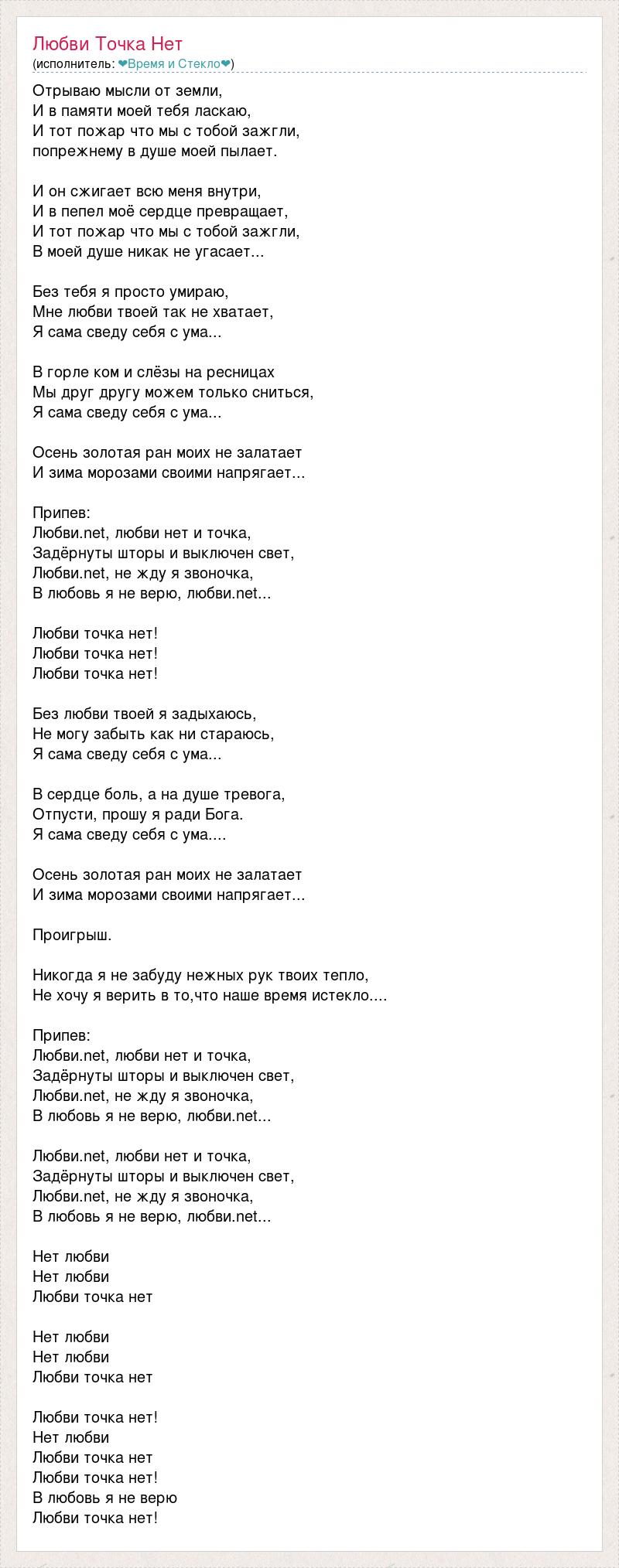 Отрываю мысли от земли, И в памяти моей тебя ласкаю, И тот пожар что мы с тобой зажгли, попрежнему в душе моей пылает. И он сжигает всю меня внутри, И в пепел моё сердце превращает, И тот пожар что мы с тобой зажгли, В моей душе никак не угасает... Без тебя я просто умираю, Мне любви твоей так не хватает, Я сама сведу себя с ума... В горле ком и слёзы на ресницах Мы друг другу можем только сниться, Я сама сведу себя с ума... Осень золотая ран моих не залатает И зима морозами своими напрягает... Припев: Любви.net, любви нет и точка, Задёрнуты шторы и выключен свет, Любви.net, не жду я звоночка, В любовь я не верю, любви.net... Любви точка нет! Любви точка нет! Любви точка нет! Без любви твоей я задыхаюсь, Не могу забыть как ни стараюсь, Я сама сведу себя с ума... В сердце боль, а на душе тревога, Отпусти, прошу я ради Бога. Я сама сведу себя с ума.... Осень золотая ран моих не залатает И зима морозами своими напрягает... Проигрыш. Никогда я не забуду нежных рук твоих тепло, Не хочу я верить в то,что наше время истекло.... Припев: Любви.net, любви нет и точка, Задёрнуты шторы и выключен свет, Любви.net, не жду я звоночка, В любовь я не верю, любви.net... Любви.net, любви нет и точка, Задёрнуты шторы и выключен свет, Любви.net, не жду я звоночка, В любовь я не верю, любви.net... Нет любви Нет любви Любви точка нет Нет любви Нет любви Любви точка нет Любви точка нет! Нет любви Любви точка нет Любви точка нет! В любовь я не верю Любви точка нет!