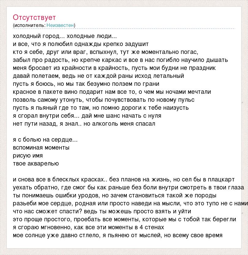 холодный город... холодные люди... и все, что я полюбил однажды крепко задушит кто я себе, друг или враг, вспыхнул, тут же моментально погас, забыл про радость, но крепче каркас и все в нас погибло научило дышать меня бросает из крайности в крайность, пусть мои будни не праздник давай полетаем, ведь не от каждой раны исход летальный пусть я боюсь, но мы так безумно ползем по грани красное в пакете вино подарит нам все то, о чем мы ночами мечтали позволь самому утонуть, чтобы почувствовать по новому пульс пусть я пьяный где то там, но помню дороги к тебе наизусть я сгорал внутри себя... дай мне шанс начать с нуля нет пути назад, я знал.. но алкоголь меня спасал я с болью на сердце... вспоминая моменты рисую имя твое акварелью и снова все в блесклых красках.. без планов на жизнь, но сел бы в плацкарт уехать обратно, где смог бы как раньше без боли внутри смотреть в твои глаза ты понимаешь ошибки уродов, но зачем становиться такой же породы разьеби мое сердце, родная или просто наведи на мысли, что это тупо не с нами что нас сможет спасти? ведь ты можешь просто взять и уйти это проще простого, проебать все моменты, которые мы с тобой так берегли я сгораю мгновенно, как все эти моменты в 4 стенах мое солнце уже давно стлело, я пьянею от мыслей, но всему свое время
