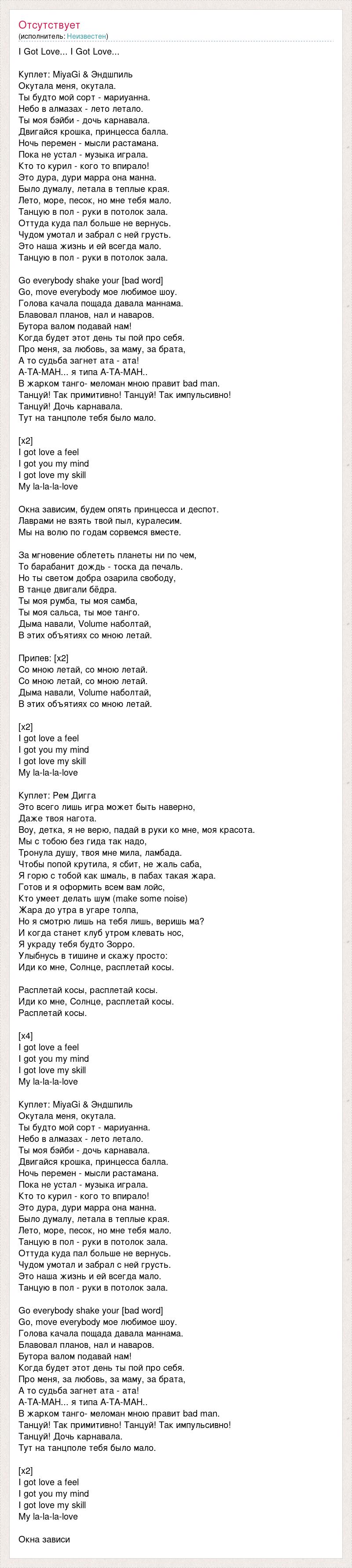 I Got Love... I Got Love... Куплет: MiyaGi & Эндшпиль Окутала меня, окутала. Ты будто мой сорт - мариуанна. Небо в алмазах - лето летало. Ты моя бэйби - дочь карнавала. Двигайся крошка, принцесса балла. Ночь перемен - мысли растамана. Пока не устал - музыка играла. Кто то курил - кого то впирало! Это дура, дури марра она манна. Было думалу, летала в теплые края. Лето, море, песок, но мне тебя мало. Танцую в пол - руки в потолок зала. Оттуда куда пал больше не вернусь. Чудом умотал и забрал с ней грусть. Это наша жизнь и ей всегда мало. Танцую в пол - руки в потолок зала. Go everybody shake your [bad word] Go, move everybody мое любимое шоу. Голова качала пощада давала маннама. Блавовал планов, нал и наваров. Бутора валом подавай нам! Когда будет этот день ты пой про себя. Про меня, за любовь, за маму, за брата, А то судьба загнет ата - ата! А-ТА-МАН... я типа А-ТА-МАН.. В жарком танго- меломан мною правит bad man. Танцуй! Так примитивно! Танцуй! Так импульсивно! Танцуй! Дочь карнавала. Тут на танцполе тебя было мало. [x2] I got love a feel I got you my mind I got love my skill My la-la-la-love Окна зависим, будем опять принцесса и деспот. Лаврами не взять твой пыл, куралесим. Мы на волю по годам сорвемся вместе. За мгновение облететь планеты ни по чем, То барабанит дождь - тоска да печаль. Но ты светом добра озарила свободу, В танце двигали бёдра. Ты моя румба, ты моя самба, Ты моя сальса, ты мое танго. Дыма навали, Volume наболтай, В этих объятиях со мною летай. Припев: [х2] Со мною летай, со мною летай. Со мною летай, со мною летай. Дыма навали, Volume наболтай, В этих объятиях со мною летай. [х2] I got love a feel I got you my mind I got love my skill My la-la-la-love Куплет: Рем Дигга Это всего лишь игра может быть наверно, Даже твоя нагота. Воу, детка, я не верю, падай в руки ко мне, моя красота. Мы с тобою без гида так надо, Тронула душу, твоя мне мила, ламбада. Чтобы попой крутила, я сбит, не жаль саба, Я горю с тобой как шмаль, в пабах такая жара. Готов и я оформить всем вам лойс, Кто умеет делать шум (make some noise) Жара до утра в угаре толпа, Но я смотрю лишь на тебя лишь, веришь ма? И когда станет клуб утром клевать нос, Я украду тебя будто Зорро. Улыбнусь в тишине и скажу просто: Иди ко мне, Солнце, расплетай косы. Расплетай косы, расплетай косы. Иди ко мне, Солнце, расплетай косы. Расплетай косы. [x4] I got love a feel I got you my mind I got love my skill My la-la-la-love Куплет: MiyaGi & Эндшпиль Окутала меня, окутала. Ты будто мой сорт - мариуанна. Небо в алмазах - лето летало. Ты моя бэйби - дочь карнавала. Двигайся крошка, принцесса балла. Ночь перемен - мысли растамана. Пока не устал - музыка играла. Кто то курил - кого то впирало! Это дура, дури марра она манна. Было думалу, летала в теплые края. Лето, море, песок, но мне тебя мало. Танцую в пол - руки в потолок зала. Оттуда куда пал больше не вернусь. Чудом умотал и забрал с ней грусть. Это наша жизнь и ей всегда мало. Танцую в пол - руки в потолок зала. Go everybody shake your [bad word] Go, move everybody мое любимое шоу. Голова качала пощада давала маннама. Блавовал планов, нал и наваров. Бутора валом подавай нам! Когда будет этот день ты пой про себя. Про меня, за любовь, за маму, за брата, А то судьба загнет ата - ата! А-ТА-МАН... я типа А-ТА-МАН.. В жарком танго- меломан мною правит bad man. Танцуй! Так примитивно! Танцуй! Так импульсивно! Танцуй! Дочь карнавала. Тут на танцполе тебя было мало. [x2] I got love a feel I got you my mind I got love my skill My la-la-la-love Окна зависи