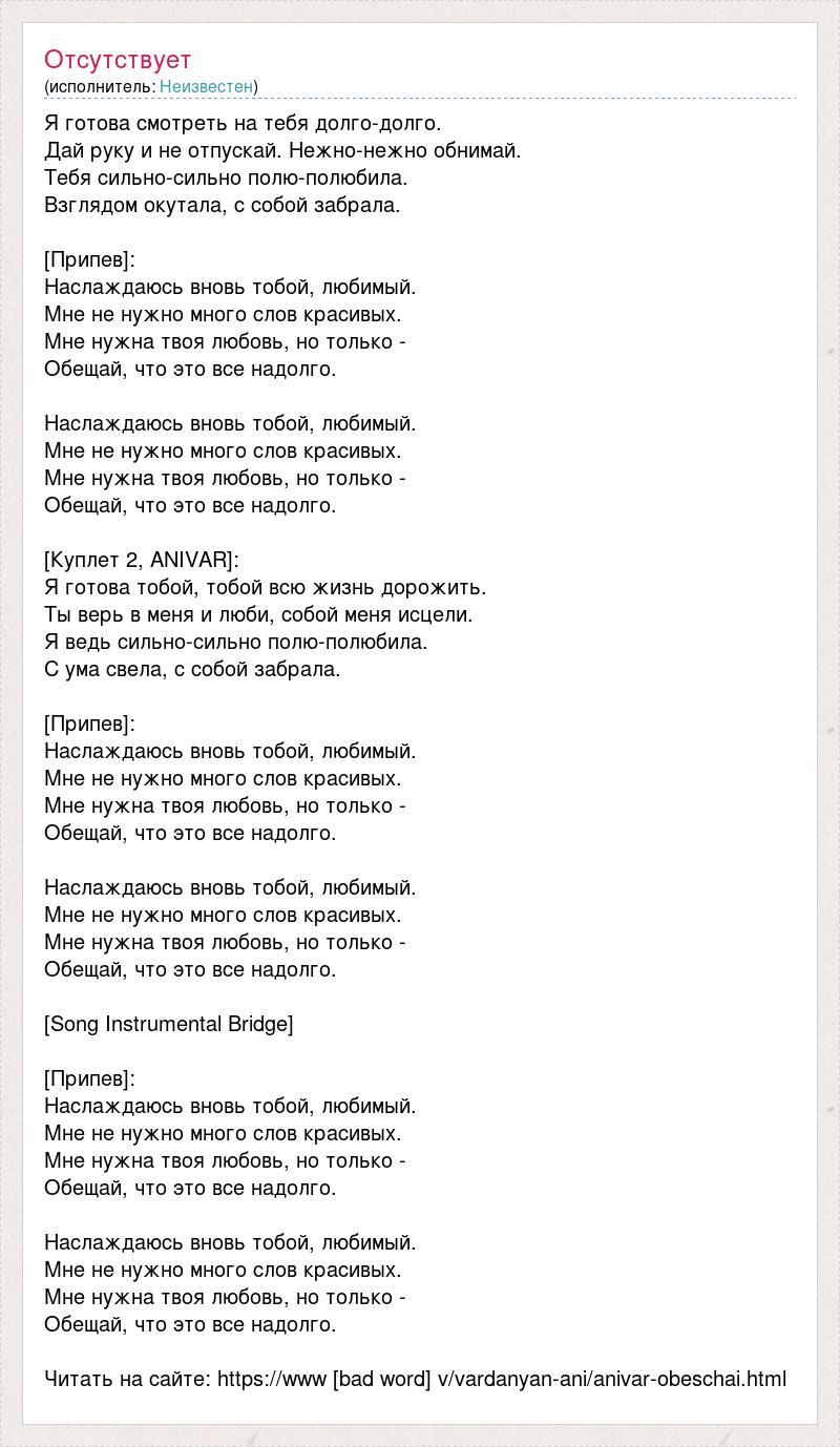 Я готова смотреть на тебя долго-долго. Дай руку и не отпускай. Нежно-нежно обнимай. Тебя сильно-сильно полю-полюбила. Взглядом окутала, с собой забрала. [Припев]: Наслаждаюсь вновь тобой, любимый. Мне не нужно много слов красивых. Мне нужна твоя любовь, но только - Обещай, что это все надолго. Наслаждаюсь вновь тобой, любимый. Мне не нужно много слов красивых. Мне нужна твоя любовь, но только - Обещай, что это все надолго. [Куплет 2, ANIVAR]: Я готова тобой, тобой всю жизнь дорожить. Ты верь в меня и люби, собой меня исцели. Я ведь сильно-сильно полю-полюбила. С ума свела, с собой забрала. [Припев]: Наслаждаюсь вновь тобой, любимый. Мне не нужно много слов красивых. Мне нужна твоя любовь, но только - Обещай, что это все надолго. Наслаждаюсь вновь тобой, любимый. Мне не нужно много слов красивых. Мне нужна твоя любовь, но только - Обещай, что это все надолго. [Song Instrumental Bridge] [Припев]: Наслаждаюсь вновь тобой, любимый. Мне не нужно много слов красивых. Мне нужна твоя любовь, но только - Обещай, что это все надолго. Наслаждаюсь вновь тобой, любимый. Мне не нужно много слов красивых. Мне нужна твоя любовь, но только - Обещай, что это все надолго. Читать на сайте: https://www [bad word] v/vardanyan-ani/anivar-obeschai.html