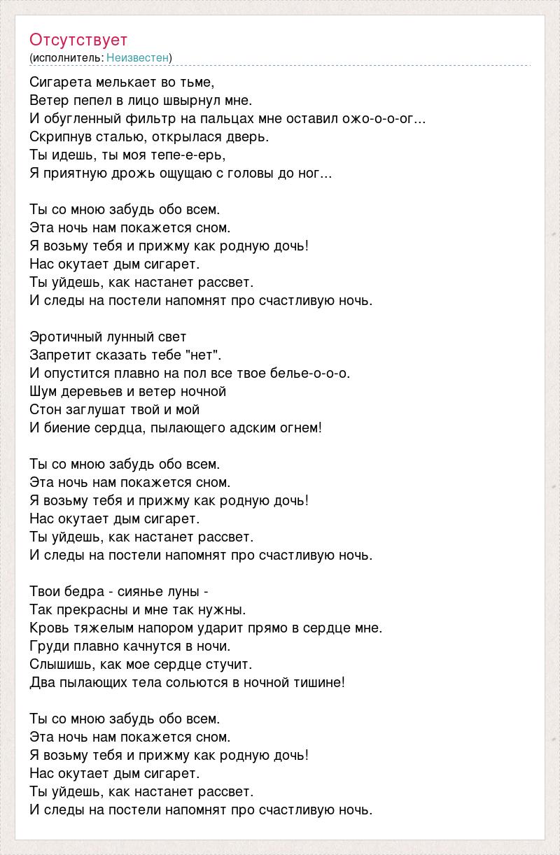 Сигарета мелькает во тьме, Ветер пепел в лицо швырнул мне. И обугленный фильтр на пальцах мне оставил ожо-о-о-ог... Скрипнув сталью, открылася дверь. Ты идешь, ты моя тепе-е-ерь, Я приятную дрожь ощущаю с головы до ног... Ты со мною забудь обо всем. Эта ночь нам покажется сном. Я возьму тебя и прижму как родную дочь! Нас окутает дым сигарет. Ты уйдешь, как настанет рассвет. И следы на постели напомнят про счастливую ночь. Эротичный лунный свет Запретит сказать тебе "нет". И опустится плавно на пол все твое белье-о-о-о. Шум деревьев и ветер ночной Стон заглушат твой и мой И биение сердца, пылающего адским огнем! Ты со мною забудь обо всем. Эта ночь нам покажется сном. Я возьму тебя и прижму как родную дочь! Нас окутает дым сигарет. Ты уйдешь, как настанет рассвет. И следы на постели напомнят про счастливую ночь. Твои бедра - сиянье луны - Так прекрасны и мне так нужны. Кровь тяжелым напором ударит прямо в сердце мне. Груди плавно качнутся в ночи. Слышишь, как мое сердце стучит. Два пылающих тела сольются в ночной тишине! Ты со мною забудь обо всем. Эта ночь нам покажется сном. Я возьму тебя и прижму как родную дочь! Нас окутает дым сигарет. Ты уйдешь, как настанет рассвет. И следы на постели напомнят про счастливую ночь.