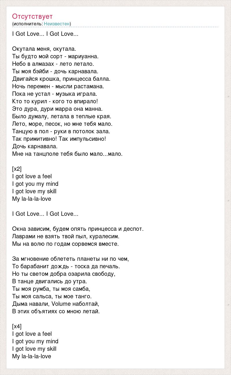 I Got Love... I Got Love... Окутала меня, окутала. Ты будто мой сорт - мариуанна. Небо в алмазах - лето летало. Ты моя бэйби - дочь карнавала. Двигайся крошка, принцесса балла. Ночь перемен - мысли растамана. Пока не устал - музыка играла. Кто то курил - кого то впирало! Это дура, дури марра она манна. Было думалу, летала в теплые края. Лето, море, песок, но мне тебя мало. Танцую в пол - руки в потолок зала. Так примитивно! Так импульсивно! Дочь карнавала. Мне на танцполе тебя было мало...мало. [x2] I got love a feel I got you my mind I got love my skill My la-la-la-love I Got Love... I Got Love... Окна зависим, будем опять принцесса и деспот. Лаврами не взять твой пыл, куралесим. Мы на волю по годам сорвемся вместе. За мгновение облететь планеты ни по чем, То барабанит дождь - тоска да печаль. Но ты светом добра озарила свободу, В танце двигались до утра. Ты моя румба, ты моя самба, Ты моя сальса, ты мое танго. Дыма навали, Volume наболтай, В этих объятиях со мною летай. [x4] I got love a feel I got you my mind I got love my skill My la-la-la-love