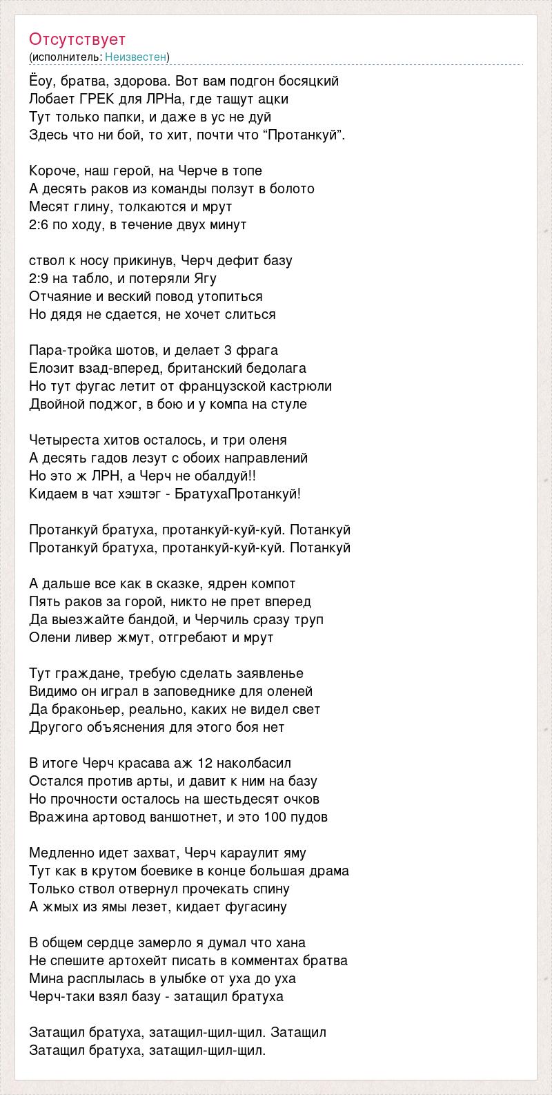 Ёоу, братва, здорова. Вот вам подгон босяцкий Лобает ГРЕК для ЛРНа, где тащут ацки Тут только папки, и даже в ус не дуй Здесь что ни бой, то хит, почти что “Протанкуй”. Короче, наш герой, на Черче в топе А десять раков из команды ползут в болото Месят глину, толкаются и мрут 2:6 по ходу, в течение двух минут ствол к носу прикинув, Черч дефит базу 2:9 на табло, и потеряли Ягу Отчаяние и веский повод утопиться Но дядя не сдается, не хочет слиться Пара-тройка шотов, и делает 3 фрага Елозит взад-вперед, британский бедолага Но тут фугас летит от французской кастрюли Двойной поджог, в бою и у компа на стуле Четыреста хитов осталось, и три оленя А десять гадов лезут с обоих направлений Но это ж ЛРН, а Черч не обалдуй!! Кидаем в чат хэштэг - БратухаПротанкуй! Протанкуй братуха, протанкуй-куй-куй. Потанкуй Протанкуй братуха, протанкуй-куй-куй. Потанкуй А дальше все как в сказке, ядрен компот Пять раков за горой, никто не прет вперед Да выезжайте бандой, и Черчиль сразу труп Олени ливер жмут, отгребают и мрут Тут граждане, требую сделать заявленье Видимо он играл в заповеднике для оленей Да браконьер, реально, каких не видел свет Другого объяснения для этого боя нет В итоге Черч красава аж 12 наколбасил Остался против арты, и давит к ним на базу Но прочности осталось на шестьдесят очков Вражина артовод ваншотнет, и это 100 пудов Медленно идет захват, Черч караулит яму Тут как в крутом боевике в конце большая драма Только ствол отвернул прочекать спину А жмых из ямы лезет, кидает фугасину В общем сердце замерло я думал что хана Не спешите артохейт писать в комментах братва Мина расплылась в улыбке от уха до уха Черч-таки взял базу - затащил братуха Затащил братуха, затащил-щил-щил. Затащил Затащил братуха, затащил-щил-щил.