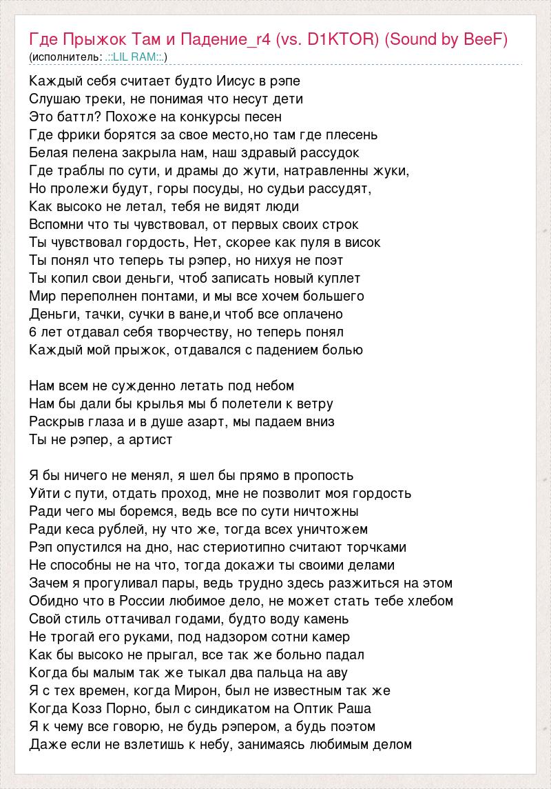Каждый себя считает будто Иисус в рэпе Слушаю треки, не понимая что несут дети Это баттл? Похоже на конкурсы песен Где фрики борятся за свое место,но там где плесень Белая пелена закрыла нам, наш здравый рассудок Где траблы по сути, и драмы до жути, натравленны жуки, Но пролежи будут, горы посуды, но судьи рассудят, Как высоко не летал, тебя не видят люди Вспомни что ты чувствовал, от первых своих строк Ты чувствовал гордость, Нет, скорее как пуля в висок Ты понял что теперь ты рэпер, но нихуя не поэт Ты копил свои деньги, чтоб записать новый куплет Мир переполнен понтами, и мы все хочем большего Деньги, тачки, сучки в ване,и чтоб все оплачено 6 лет отдавал себя творчеству, но теперь понял Каждый мой прыжок, отдавался с падением болью Нам всем не сужденно летать под небом Нам бы дали бы крылья мы б полетели к ветру Раскрыв глаза и в душе азарт, мы падаем вниз Ты не рэпер, а артист Я бы ничего не менял, я шел бы прямо в пропость Уйти с пути, отдать проход, мне не позволит моя гордость Ради чего мы боремся, ведь все по сути ничтожны Ради кеса рублей, ну что же, тогда всех уничтожем Рэп опустился на дно, нас стериотипно считают торчками Не способны не на что, тогда докажи ты своими делами Зачем я прогуливал пары, ведь трудно здесь разжиться на этом Обидно что в России любимое дело, не может стать тебе хлебом Свой стиль оттачивал годами, будто воду камень Не трогай его руками, под надзором сотни камер Как бы высоко не прыгал, все так же больно падал Когда бы малым так же тыкал два пальца на аву Я с тех времен, когда Мирон, был не известным так же Когда Козз Порно, был с синдикатом на Оптик Раша Я к чему все говорю, не будь рэпером, а будь поэтом Даже если не взлетишь к небу, занимаясь любимым делом