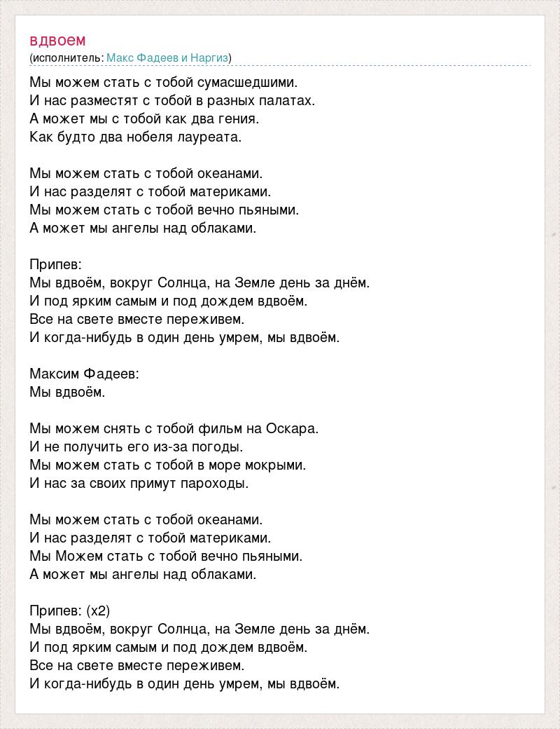 Мы можем стать с тобой сумасшедшими. И нас разместят с тобой в разных палатах. А может мы с тобой как два гения. Как будто два нобеля лауреата. Мы можем стать с тобой океанами. И нас разделят с тобой материками. Мы можем стать с тобой вечно пьяными. А может мы ангелы над облаками. Припев: Мы вдвоём, вокруг Солнца, на Земле день за днём. И под ярким самым и под дождем вдвоём. Все на свете вместе переживем. И когда-нибудь в один день умрем, мы вдвоём. Максим Фадеев: Мы вдвоём. Мы можем снять с тобой фильм на Оскара. И не получить его из-за погоды. Мы можем стать с тобой в море мокрыми. И нас за своих примут пароходы. Мы можем стать с тобой океанами. И нас разделят с тобой материками. Мы Можем стать с тобой вечно пьяными. А может мы ангелы над облаками. Припев: (х2) Мы вдвоём, вокруг Солнца, на Земле день за днём. И под ярким самым и под дождем вдвоём. Все на свете вместе переживем. И когда-нибудь в один день умрем, мы вдвоём.