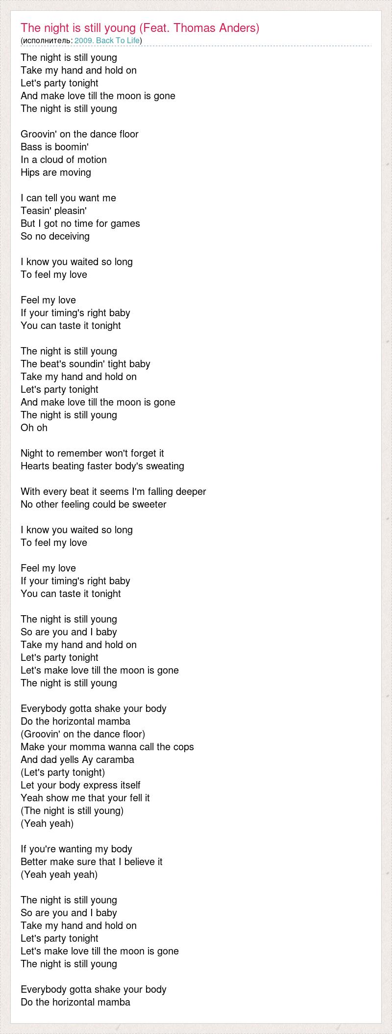 The night is still young Take my hand and hold on Let's party tonight And make love till the moon is gone The night is still young Groovin' on the dance floor Bass is boomin' In a cloud of motion Hips are moving I can tell you want me Teasin' pleasin' But I got no time for games So no deceiving I know you waited so long To feel my love Feel my love If your timing's right baby You can taste it tonight The night is still young The beat's soundin' tight baby Take my hand and hold on Let's party tonight And make love till the moon is gone The night is still young Oh oh Night to remember won't forget it Hearts beating faster body's sweating With every beat it seems I'm falling deeper No other feeling could be sweeter I know you waited so long To feel my love Feel my love If your timing's right baby You can taste it tonight The night is still young So are you and I baby Take my hand and hold on Let's party tonight Let's make love till the moon is gone The night is still young Everybody gotta shake your body Do the horizontal mamba (Groovin' on the dance floor) Make your momma wanna call the cops And dad yells Ay caramba (Let's party tonight) Let your body express itself Yeah show me that your fell it (The night is still young) (Yeah yeah) If you're wanting my body Better make sure that I believe it (Yeah yeah yeah) The night is still young So are you and I baby Take my hand and hold on Let's party tonight Let's make love till the moon is gone The night is still young Everybody gotta shake your body Do the horizontal mamba