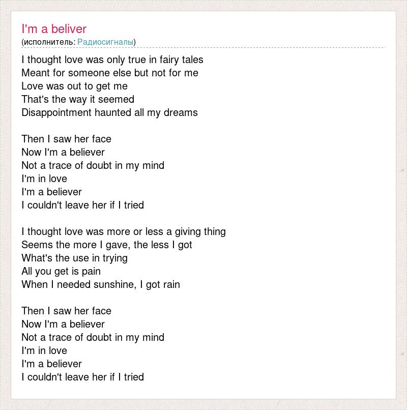 I thought love was only true in fairy tales Meant for someone else but not for me Love was out to get me That's the way it seemed Disappointment haunted all my dreams Then I saw her face Now I'm a believer Not a trace of doubt in my mind I'm in love I'm a believer I couldn't leave her if I tried I thought love was more or less a giving thing Seems the more I gave, the less I got What's the use in trying All you get is pain When I needed sunshine, I got rain Then I saw her face Now I'm a believer Not a trace of doubt in my mind I'm in love I'm a believer I couldn't leave her if I tried