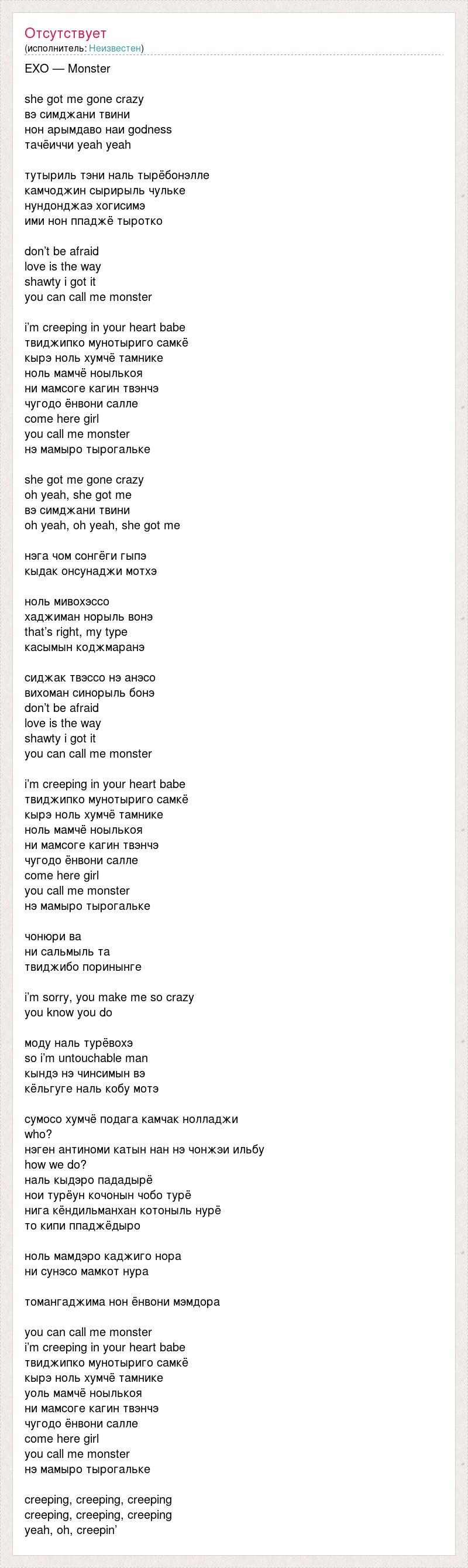 EXO — Monster she got me gone crazy вэ симджани твини нон арымдаво наи godness тачёиччи yeah yeah тутыриль тэни наль тырёбонэлле камчоджин сырирыль чульке нундонджаэ хогисимэ ими нон ппаджё тыротко don’t be afraid love is the way shawty i got it you can call me monster i’m creeping in your heart babe твиджипко мунотыриго самкё кырэ ноль хумчё тамнике ноль мамчё ноылькоя ни мамсоге кагин твэнчэ чугодо ёнвони салле come here girl you call me monster нэ мамыро тырогальке she got me gone crazy oh yeah, she got me вэ симджани твини oh yeah, oh yeah, she got me нэга чом сонгёги гыпэ кыдак онсунаджи мотхэ ноль мивохэссо хаджиман норыль вонэ that’s right, my type касымын коджмаранэ сиджак твэссо нэ анэсо вихоман синорыль бонэ don’t be afraid love is the way shawty i got it you can call me monster i’m creeping in your heart babe твиджипко мунотыриго самкё кырэ ноль хумчё тамнике ноль мамчё ноылькоя ни мамсоге кагин твэнчэ чугодо ёнвони салле come here girl you call me monster нэ мамыро тырогальке чонюри ва ни сальмыль та твиджибо поринынге i’m sorry, you make me so crazy you know you do моду наль турёвохэ so i’m untouchable man кындэ нэ чинсимын вэ кёльгуге наль кобу мотэ сумосо хумчё подага камчак нолладжи who? нэген антиноми катын нан нэ чонжэи ильбу how we do? наль кыдэро пададырё нои турёун кочонын чобо турё нига кёндильманхан котоныль нурё то кипи ппаджёдыро ноль мамдэро каджиго нора ни сунэсо мамкот нура томангаджима нон ёнвони мэмдора you can call me monster i’m creeping in your heart babe твиджипко мунотыриго самкё кырэ ноль хумчё тамнике yоль мамчё ноылькоя ни мамсоге кагин твэнчэ чугодо ёнвони салле come here girl you call me monster нэ мамыро тырогальке creeping, creeping, creeping creeping, creeping, creeping yeah, oh, creepin’