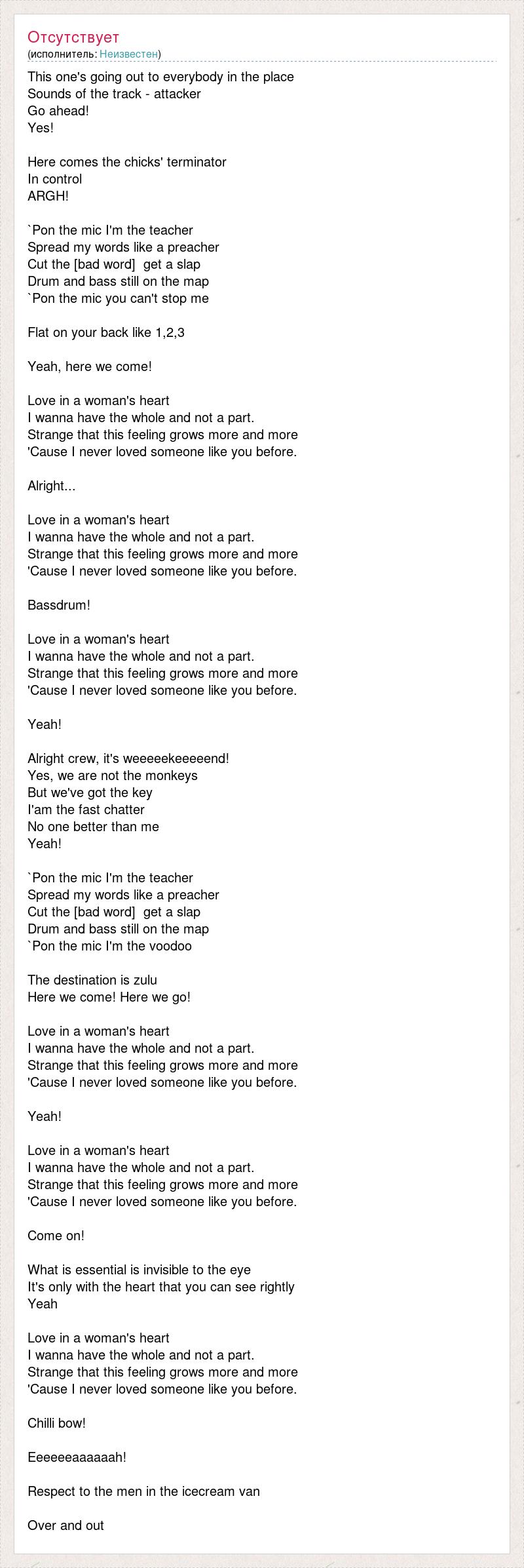 This one's going out to everybody in the place Sounds of the track - attacker Go ahead! Yes! Here comes the chicks' terminator In control ARGH! `Pon the mic I'm the teacher Spread my words like a preacher Cut the [bad word] get a slap Drum and bass still on the map `Pon the mic you can't stop me Flat on your back like 1,2,3 Yeah, here we come! Love in a woman's heart I wanna have the whole and not a part. Strange that this feeling grows more and more 'Cause I never loved someone like you before. Alright... Love in a woman's heart I wanna have the whole and not a part. Strange that this feeling grows more and more 'Cause I never loved someone like you before. Bassdrum! Love in a woman's heart I wanna have the whole and not a part. Strange that this feeling grows more and more 'Cause I never loved someone like you before. Yeah! Alright crew, it's weeeeekeeeeend! Yes, we are not the monkeys But we've got the key I'am the fast chatter No one better than me Yeah! `Pon the mic I'm the teacher Spread my words like a preacher Cut the [bad word] get a slap Drum and bass still on the map `Pon the mic I'm the voodoo The destination is zulu Here we come! Here we go! Love in a woman's heart I wanna have the whole and not a part. Strange that this feeling grows more and more 'Cause I never loved someone like you before. Yeah! Love in a woman's heart I wanna have the whole and not a part. Strange that this feeling grows more and more 'Cause I never loved someone like you before. Come on! What is essential is invisible to the eye It's only with the heart that you can see rightly Yeah Love in a woman's heart I wanna have the whole and not a part. Strange that this feeling grows more and more 'Cause I never loved someone like you before. Chilli bow! Eeeeeeaaaaaah! Respect to the men in the icecream van Over and out