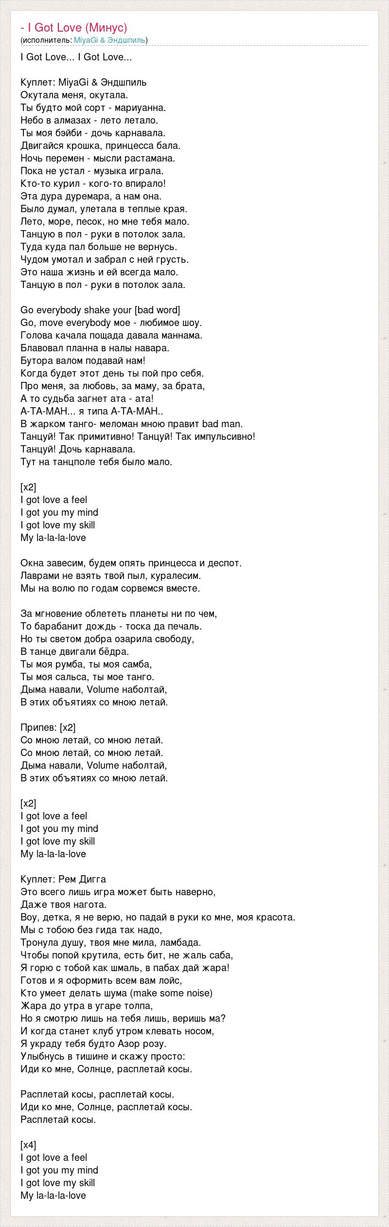 I Got Love... I Got Love... Куплет: MiyaGi & Эндшпиль Окутала меня, окутала. Ты будто мой сорт - мариуанна. Небо в алмазах - лето летало. Ты моя бэйби - дочь карнавала. Двигайся крошка, принцесса бала. Ночь перемен - мысли растамана. Пока не устал - музыка играла. Кто-то курил - кого-то впирало! Эта дура дуремара, а нам она. Было думал, улетала в теплые края. Лето, море, песок, но мне тебя мало. Танцую в пол - руки в потолок зала. Туда куда пал больше не вернусь. Чудом умотал и забрал с ней грусть. Это наша жизнь и ей всегда мало. Танцую в пол - руки в потолок зала. Go everybody shake your [bad word] Go, move everybody мое - любимое шоу. Голова качала пощада давала маннама. Блавовал планна в налы навара. Бутора валом подавай нам! Когда будет этот день ты пой про себя. Про меня, за любовь, за маму, за брата, А то судьба загнет ата - ата! А-ТА-МАН... я типа А-ТА-МАН.. В жарком танго- меломан мною правит bad man. Танцуй! Так примитивно! Танцуй! Так импульсивно! Танцуй! Дочь карнавала. Тут на танцполе тебя было мало. [x2] I got love a feel I got you my mind I got love my skill My la-la-la-love Окна завесим, будем опять принцесса и деспот. Лаврами не взять твой пыл, куралесим. Мы на волю по годам сорвемся вместе. За мгновение облететь планеты ни по чем, То барабанит дождь - тоска да печаль. Но ты светом добра озарила свободу, В танце двигали бёдра. Ты моя румба, ты моя самба, Ты моя сальса, ты мое танго. Дыма навали, Volume наболтай, В этих объятиях со мною летай. Припев: [х2] Со мною летай, со мною летай. Со мною летай, со мною летай. Дыма навали, Volume наболтай, В этих объятиях со мною летай. [х2] I got love a feel I got you my mind I got love my skill My la-la-la-love Куплет: Рем Дигга Это всего лишь игра может быть наверно, Даже твоя нагота. Воу, детка, я не верю, но падай в руки ко мне, моя красота. Мы с тобою без гида так надо, Тронула душу, твоя мне мила, ламбада. Чтобы попой крутила, есть бит, не жаль саба, Я горю с тобой как шмаль, в пабах дай жара! Готов и я оформить всем вам лойс, Кто умеет делать шума (make some noise) Жара до утра в угаре толпа, Но я смотрю лишь на тебя лишь, веришь ма? И когда станет клуб утром клевать носом, Я украду тебя будто Азор розу. Улыбнусь в тишине и скажу просто: Иди ко мне, Солнце, расплетай косы. Расплетай косы, расплетай косы. Иди ко мне, Солнце, расплетай косы. Расплетай косы. [x4] I got love a feel I got you my mind I got love my skill My la-la-la-love
