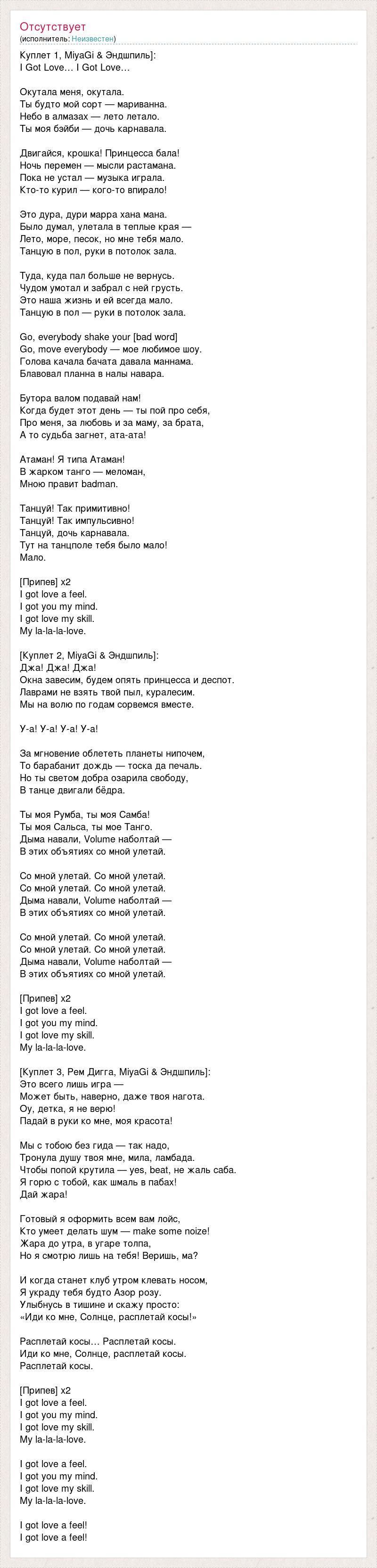 Куплет 1, MiyaGi & Эндшпиль]: I Got Love… I Got Love… Окутала меня, окутала. Ты будто мой сорт — мариванна. Небо в алмазах — лето летало. Ты моя бэйби — дочь карнавала. Двигайся, крошка! Принцесса бала! Ночь перемен — мысли растамана. Пока не устал — музыка играла. Кто-то курил — кого-то впирало! Это дура, дури марра хана мана. Было думал, улетала в теплые края — Лето, море, песок, но мне тебя мало. Танцую в пол, руки в потолок зала. Туда, куда пал больше не вернусь. Чудом умотал и забрал с ней грусть. Это наша жизнь и ей всегда мало. Танцую в пол — руки в потолок зала. Go, everybody shake your [bad word] Go, move everybody — мое любимое шоу. Голова качала бачата давала маннама. Блавовал планна в налы навара. Бутора валом подавай нам! Когда будет этот день — ты пой про себя, Про меня, за любовь и за маму, за брата, А то судьба загнет, ата-ата! Атаман! Я типа Атаман! В жарком танго — меломан, Мною правит badman. Танцуй! Так примитивно! Танцуй! Так импульсивно! Танцуй, дочь карнавала. Тут на танцполе тебя было мало! Мало. [Припев] x2 I got love а feel. I got you my mind. I got love my skill. My la-la-la-love. [Куплет 2, MiyaGi & Эндшпиль]: Джа! Джа! Джа! Окна завесим, будем опять принцесса и деспот. Лаврами не взять твой пыл, куралесим. Мы на волю по годам сорвемся вместе. У-а! У-а! У-а! У-а! За мгновение облететь планеты нипочем, То барабанит дождь — тоска да печаль. Но ты светом добра озарила свободу, В танце двигали бёдра. Ты моя Румба, ты моя Самба! Ты моя Сальса, ты мое Танго. Дыма навали, Volume наболтай — В этих объятиях со мной улетай. Со мной улетай. Со мной улетай. Со мной улетай. Со мной улетай. Дыма навали, Volume наболтай — В этих объятиях со мной улетай. Со мной улетай. Со мной улетай. Со мной улетай. Со мной улетай. Дыма навали, Volume наболтай — В этих объятиях со мной улетай. [Припев] x2 I got love а feel. I got you my mind. I got love my skill. My la-la-la-love. [Куплет 3, Рем Дигга, MiyaGi & Эндшпиль]: Это всего лишь игра — Может быть, наверно, даже твоя нагота. Оу, детка, я не верю! Падай в руки ко мне, моя красота! Мы с тобою без гида — так надо, Тронула душу твоя мне, мила, ламбада. Чтобы попой крутила — yes, beat, не жаль саба. Я горю с тобой, как шмаль в пабах! Дай жара! Готовый я оформить всем вам лойс, Кто умеет делать шум — make some noize! Жара до утра, в угаре толпа, Но я смотрю лишь на тебя! Веришь, ма? И когда станет клуб утром клевать носом, Я украду тебя будто Азор розу. Улыбнусь в тишине и скажу просто: «Иди ко мне, Солнце, расплетай косы!» Расплетай косы… Расплетай косы. Иди ко мне, Солнце, расплетай косы. Расплетай косы. [Припев] x2 I got love а feel. I got you my mind. I got love my skill. My la-la-la-love. I got love а feel. I got you my mind. I got love my skill. My la-la-la-love. I got love a feel! I got love a feel!