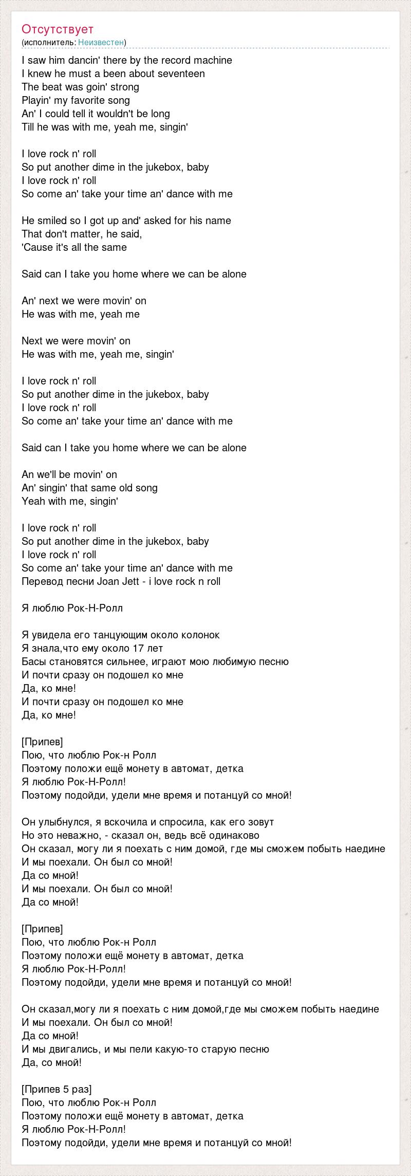 I saw him dancin' there by the record machine I knew he must a been about seventeen The beat was goin' strong Playin' my favorite song An' I could tell it wouldn't be long Till he was with me, yeah me, singin' I love rock n' roll So put another dime in the jukebox, baby I love rock n' roll So come an' take your time an' dance with me He smiled so I got up and' asked for his name That don't matter, he said, 'Cause it's all the same Said can I take you home where we can be alone An' next we were movin' on He was with me, yeah me Next we were movin' on He was with me, yeah me, singin' I love rock n' roll So put another dime in the jukebox, baby I love rock n' roll So come an' take your time an' dance with me Said can I take you home where we can be alone An we'll be movin' on An' singin' that same old song Yeah with me, singin' I love rock n' roll So put another dime in the jukebox, baby I love rock n' roll So come an' take your time an' dance with me Перевод песни Joan Jett - i love rock n roll Я люблю Рок-Н-Ролл Я увидела его танцующим около колонок Я знала,что ему около 17 лет Басы становятся сильнее, играют мою любимую песню И почти сразу он подошел ко мне Да, ко мне! И почти сразу он подошел ко мне Да, ко мне! [Припев] Пою, что люблю Рок-н Ролл Поэтому положи ещё монету в автомат, детка Я люблю Рок-Н-Ролл! Поэтому подойди, удели мне время и потанцуй со мной! Он улыбнулся, я вскочила и спросила, как его зовут Но это неважно, - сказал он, ведь всё одинаково Он сказал, могу ли я поехать с ним домой, где мы сможем побыть наедине И мы поехали. Он был со мной! Да со мной! И мы поехали. Он был со мной! Да со мной! [Припев] Пою, что люблю Рок-н Ролл Поэтому положи ещё монету в автомат, детка Я люблю Рок-Н-Ролл! Поэтому подойди, удели мне время и потанцуй со мной! Он сказал,могу ли я поехать с ним домой,где мы сможем побыть наедине И мы поехали. Он был со мной! Да со мной! И мы двигались, и мы пели какую-то старую песню Да, со мной! [Припев 5 раз] Пою, что люблю Рок-н Ролл Поэтому положи ещё монету в автомат, детка Я люблю Рок-Н-Ролл! Поэтому подойди, удели мне время и потанцуй со мной!