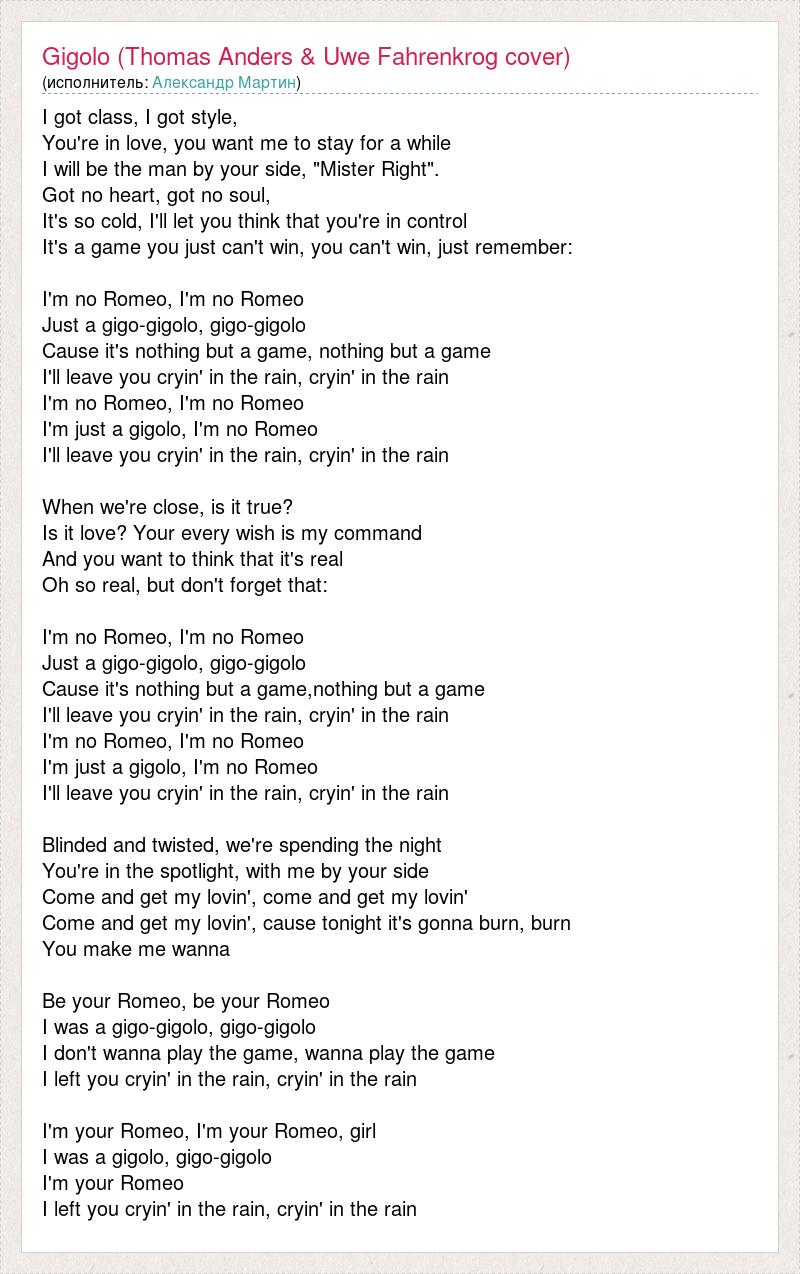 I got class, I got style, You're in love, you want me to stay for a while I will be the man by your side, "Mister Right". Got no heart, got no soul, It's so cold, I'll let you think that you're in control It's a game you just can't win, you can't win, just remember: I'm no Romeo, I'm no Romeo Just a gigo-gigolo, gigo-gigolo Cause it's nothing but a game, nothing but a game I'll leave you cryin' in the rain, cryin' in the rain I'm no Romeo, I'm no Romeo I'm just a gigolo, I'm no Romeo I'll leave you cryin' in the rain, cryin' in the rain When we're close, is it true? Is it love? Your every wish is my command And you want to think that it's real Oh so real, but don't forget that: I'm no Romeo, I'm no Romeo Just a gigo-gigolo, gigo-gigolo Cause it's nothing but a game,nothing but a game I'll leave you cryin' in the rain, cryin' in the rain I'm no Romeo, I'm no Romeo I'm just a gigolo, I'm no Romeo I'll leave you cryin' in the rain, cryin' in the rain Blinded and twisted, we're spending the night You're in the spotlight, with me by your side Come and get my lovin', come and get my lovin' Come and get my lovin', cause tonight it's gonna burn, burn You make me wanna Be your Romeo, be your Romeo I was a gigo-gigolo, gigo-gigolo I don't wanna play the game, wanna play the game I left you cryin' in the rain, cryin' in the rain I'm your Romeo, I'm your Romeo, girl I was a gigolo, gigo-gigolo I'm your Romeo I left you cryin' in the rain, cryin' in the rain
