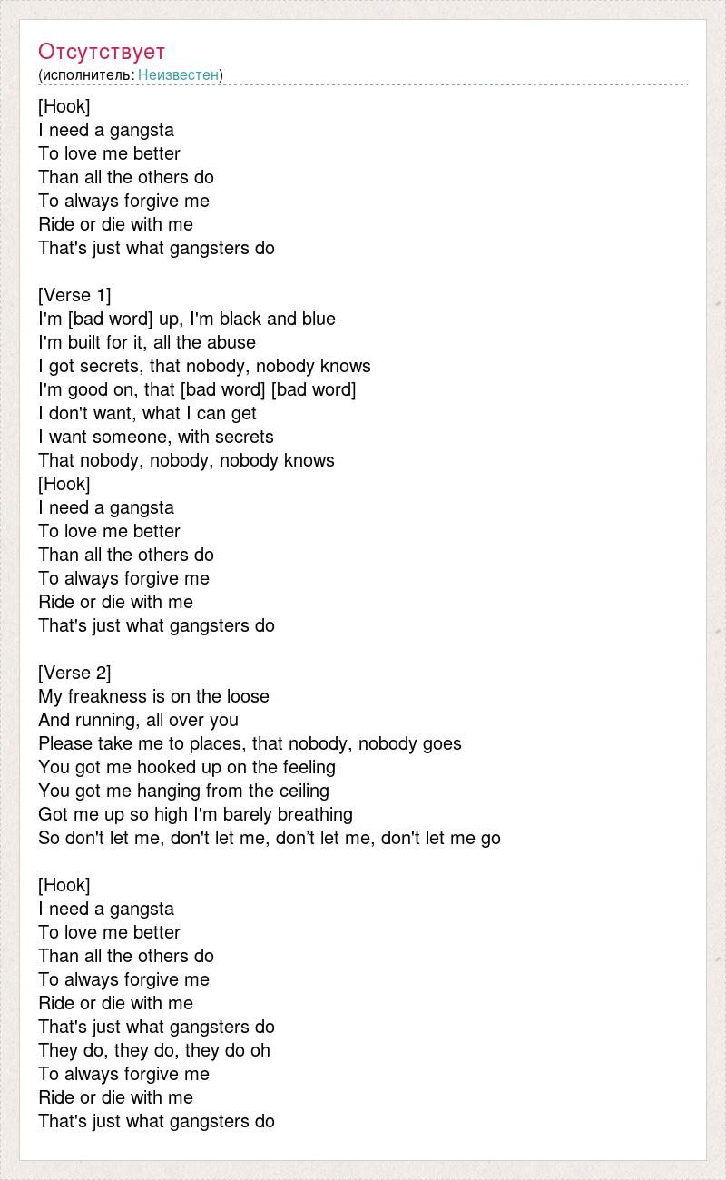 [Hook] I need a gangsta To love me better Than all the others do To always forgive me Ride or die with me That's just what gangsters do [Verse 1] I'm [bad word] up, I'm black and blue I'm built for it, all the abuse I got secrets, that nobody, nobody knows I'm good on, that [bad word] [bad word] I don't want, what I can get I want someone, with secrets That nobody, nobody, nobody knows [Hook] I need a gangsta To love me better Than all the others do To always forgive me Ride or die with me That's just what gangsters do [Verse 2] My freakness is on the loose And running, all over you Please take me to places, that nobody, nobody goes You got me hooked up on the feeling You got me hanging from the ceiling Got me up so high I'm barely breathing So don't let me, don't let me, don’t let me, don't let me go [Hook] I need a gangsta To love me better Than all the others do To always forgive me Ride or die with me That's just what gangsters do They do, they do, they do oh To always forgive me Ride or die with me That's just what gangsters do
