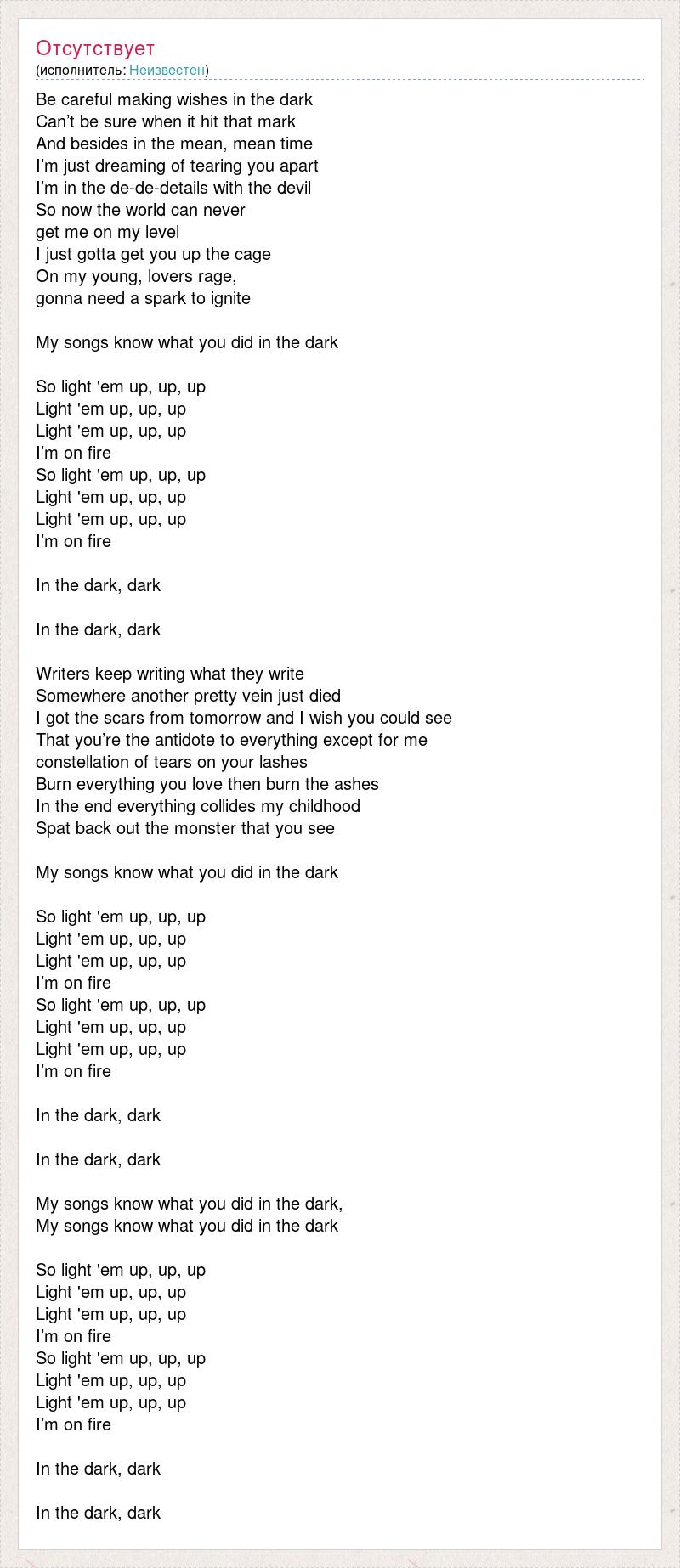 Be careful making wishes in the dark Can’t be sure when it hit that mark And besides in the mean, mean time I’m just dreaming of tearing you apart I’m in the de-de-details with the devil So now the world can never get me on my level I just gotta get you up the cage On my young, lovers rage, gonna need a spark to ignite My songs know what you did in the dark So light 'em up, up, up Light 'em up, up, up Light 'em up, up, up I’m on fire So light 'em up, up, up Light 'em up, up, up Light 'em up, up, up I’m on fire In the dark, dark In the dark, dark Writers keep writing what they write Somewhere another pretty vein just died I got the scars from tomorrow and I wish you could see That you’re the antidote to everything except for me constellation of tears on your lashes Burn everything you love then burn the ashes In the end everything collides my childhood Spat back out the monster that you see My songs know what you did in the dark So light 'em up, up, up Light 'em up, up, up Light 'em up, up, up I’m on fire So light 'em up, up, up Light 'em up, up, up Light 'em up, up, up I’m on fire In the dark, dark In the dark, dark My songs know what you did in the dark, My songs know what you did in the dark So light 'em up, up, up Light 'em up, up, up Light 'em up, up, up I’m on fire So light 'em up, up, up Light 'em up, up, up Light 'em up, up, up I’m on fire In the dark, dark In the dark, dark