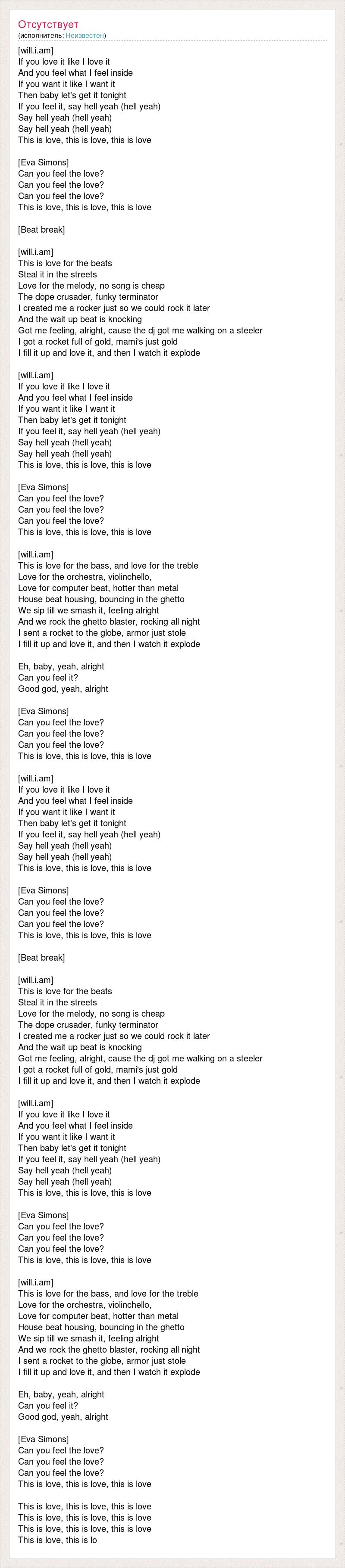 [will.i.am] If you love it like I love it And you feel what I feel inside If you want it like I want it Then baby let's get it tonight If you feel it, say hell yeah (hell yeah) Say hell yeah (hell yeah) Say hell yeah (hell yeah) This is love, this is love, this is love [Eva Simons] Can you feel the love? Can you feel the love? Can you feel the love? This is love, this is love, this is love [Beat break] [will.i.am] This is love for the beats Steal it in the streets Love for the melody, no song is cheap The dope crusader, funky terminator I created me a rocker just so we could rock it later And the wait up beat is knocking Got me feeling, alright, cause the dj got me walking on a steeler I got a rocket full of gold, mami's just gold I fill it up and love it, and then I watch it explode [will.i.am] If you love it like I love it And you feel what I feel inside If you want it like I want it Then baby let's get it tonight If you feel it, say hell yeah (hell yeah) Say hell yeah (hell yeah) Say hell yeah (hell yeah) This is love, this is love, this is love [Eva Simons] Can you feel the love? Can you feel the love? Can you feel the love? This is love, this is love, this is love [will.i.am] This is love for the bass, and love for the treble Love for the orchestra, violinchello, Love for computer beat, hotter than metal House beat housing, bouncing in the ghetto We sip till we smash it, feeling alright And we rock the ghetto blaster, rocking all night I sent a rocket to the globe, armor just stole I fill it up and love it, and then I watch it explode Eh, baby, yeah, alright Can you feel it? Good god, yeah, alright [Eva Simons] Can you feel the love? Can you feel the love? Can you feel the love? This is love, this is love, this is love [will.i.am] If you love it like I love it And you feel what I feel inside If you want it like I want it Then baby let's get it tonight If you feel it, say hell yeah (hell yeah) Say hell yeah (hell yeah) Say hell yeah (hell yeah) This is love, this is love, this is love [Eva Simons] Can you feel the love? Can you feel the love? Can you feel the love? This is love, this is love, this is love [Beat break] [will.i.am] This is love for the beats Steal it in the streets Love for the melody, no song is cheap The dope crusader, funky terminator I created me a rocker just so we could rock it later And the wait up beat is knocking Got me feeling, alright, cause the dj got me walking on a steeler I got a rocket full of gold, mami's just gold I fill it up and love it, and then I watch it explode [will.i.am] If you love it like I love it And you feel what I feel inside If you want it like I want it Then baby let's get it tonight If you feel it, say hell yeah (hell yeah) Say hell yeah (hell yeah) Say hell yeah (hell yeah) This is love, this is love, this is love [Eva Simons] Can you feel the love? Can you feel the love? Can you feel the love? This is love, this is love, this is love [will.i.am] This is love for the bass, and love for the treble Love for the orchestra, violinchello, Love for computer beat, hotter than metal House beat housing, bouncing in the ghetto We sip till we smash it, feeling alright And we rock the ghetto blaster, rocking all night I sent a rocket to the globe, armor just stole I fill it up and love it, and then I watch it explode Eh, baby, yeah, alright Can you feel it? Good god, yeah, alright [Eva Simons] Can you feel the love? Can you feel the love? Can you feel the love? This is love, this is love, this is love This is love, this is love, this is love This is love, this is love, this is love This is love, this is love, this is love This is love, this is lo