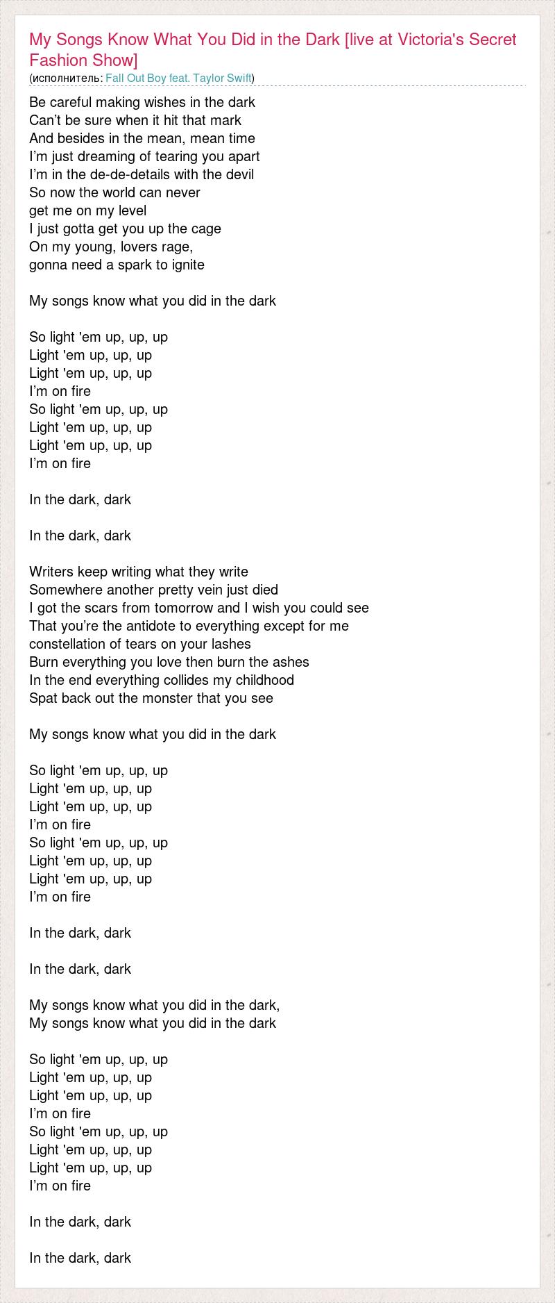 Be careful making wishes in the dark Can’t be sure when it hit that mark And besides in the mean, mean time I’m just dreaming of tearing you apart I’m in the de-de-details with the devil So now the world can never get me on my level I just gotta get you up the cage On my young, lovers rage, gonna need a spark to ignite My songs know what you did in the dark So light 'em up, up, up Light 'em up, up, up Light 'em up, up, up I’m on fire So light 'em up, up, up Light 'em up, up, up Light 'em up, up, up I’m on fire In the dark, dark In the dark, dark Writers keep writing what they write Somewhere another pretty vein just died I got the scars from tomorrow and I wish you could see That you’re the antidote to everything except for me constellation of tears on your lashes Burn everything you love then burn the ashes In the end everything collides my childhood Spat back out the monster that you see My songs know what you did in the dark So light 'em up, up, up Light 'em up, up, up Light 'em up, up, up I’m on fire So light 'em up, up, up Light 'em up, up, up Light 'em up, up, up I’m on fire In the dark, dark In the dark, dark My songs know what you did in the dark, My songs know what you did in the dark So light 'em up, up, up Light 'em up, up, up Light 'em up, up, up I’m on fire So light 'em up, up, up Light 'em up, up, up Light 'em up, up, up I’m on fire In the dark, dark In the dark, dark