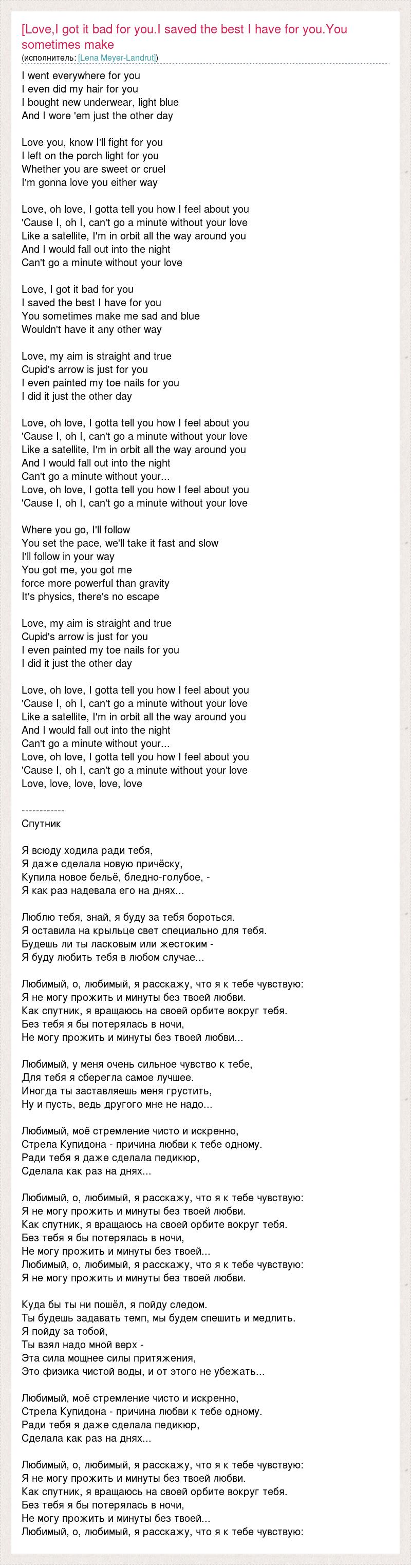 I went everywhere for you I even did my hair for you I bought new underwear, light blue And I wore 'em just the other day Love you, know I'll fight for you I left on the porch light for you Whether you are sweet or cruel I'm gonna love you either way Love, oh love, I gotta tell you how I feel about you 'Cause I, oh I, can't go a minute without your love Like a satellite, I'm in orbit all the way around you And I would fall out into the night Can't go a minute without your love Love, I got it bad for you I saved the best I have for you You sometimes make me sad and blue Wouldn't have it any other way Love, my aim is straight and true Cupid's arrow is just for you I even painted my toe nails for you I did it just the other day Love, oh love, I gotta tell you how I feel about you 'Cause I, oh I, can't go a minute without your love Like a satellite, I'm in orbit all the way around you And I would fall out into the night Can't go a minute without your... Love, oh love, I gotta tell you how I feel about you 'Cause I, oh I, can't go a minute without your love Where you go, I'll follow You set the pace, we'll take it fast and slow I'll follow in your way You got me, you got me force more powerful than gravity It's physics, there's no escape Love, my aim is straight and true Cupid's arrow is just for you I even painted my toe nails for you I did it just the other day Love, oh love, I gotta tell you how I feel about you 'Cause I, oh I, can't go a minute without your love Like a satellite, I'm in orbit all the way around you And I would fall out into the night Can't go a minute without your... Love, oh love, I gotta tell you how I feel about you 'Cause I, oh I, can't go a minute without your love Love, love, love, love, love ------------ Спутник Я всюду ходила ради тебя, Я даже сделала новую причёску, Купила новое бельё, бледно-голубое, - Я как раз надевала его на днях... Люблю тебя, знай, я буду за тебя бороться. Я оставила на крыльце свет специально для тебя. Будешь ли ты ласковым или жестоким - Я буду любить тебя в любом случае... Любимый, о, любимый, я расскажу, что я к тебе чувствую: Я не могу прожить и минуты без твоей любви. Как спутник, я вращаюсь на своей орбите вокруг тебя. Без тебя я бы потерялась в ночи, Не могу прожить и минуты без твоей любви... Любимый, у меня очень сильное чувство к тебе, Для тебя я сберегла самое лучшее. Иногда ты заставляешь меня грустить, Ну и пусть, ведь другого мне не надо... Любимый, моё стремление чисто и искренно, Стрела Купидона - причина любви к тебе одному. Ради тебя я даже сделала педикюр, Сделала как раз на днях... Любимый, о, любимый, я расскажу, что я к тебе чувствую: Я не могу прожить и минуты без твоей любви. Как спутник, я вращаюсь на своей орбите вокруг тебя. Без тебя я бы потерялась в ночи, Не могу прожить и минуты без твоей... Любимый, о, любимый, я расскажу, что я к тебе чувствую: Я не могу прожить и минуты без твоей любви. Куда бы ты ни пошёл, я пойду следом. Ты будешь задавать темп, мы будем спешить и медлить. Я пойду за тобой, Ты взял надо мной верх - Эта сила мощнее силы притяжения, Это физика чистой воды, и от этого не убежать... Любимый, моё стремление чисто и искренно, Стрела Купидона - причина любви к тебе одному. Ради тебя я даже сделала педикюр, Сделала как раз на днях... Любимый, о, любимый, я расскажу, что я к тебе чувствую: Я не могу прожить и минуты без твоей любви. Как спутник, я вращаюсь на своей орбите вокруг тебя. Без тебя я бы потерялась в ночи, Не могу прожить и минуты без твоей... Любимый, о, любимый, я расскажу, что я к тебе чувствую: