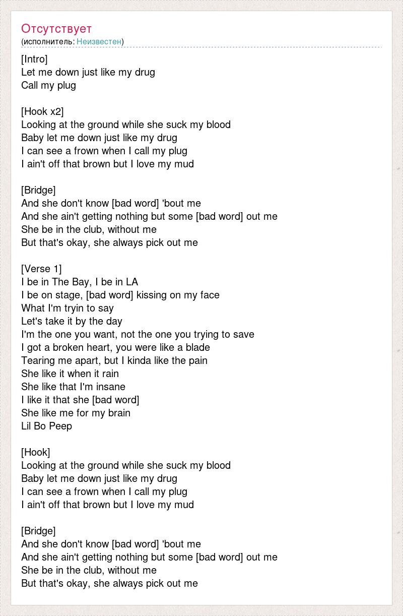 [Intro] Let me down just like my drug Call my plug [Hook x2] Looking at the ground while she suck my blood Baby let me down just like my drug I can see a frown when I call my plug I ain't off that brown but I love my mud [Bridge] And she don't know [bad word] 'bout me And she ain't getting nothing but some [bad word] out me She be in the club, without me But that's okay, she always pick out me [Verse 1] I be in The Bay, I be in LA I be on stage, [bad word] kissing on my face What I'm tryin to say Let's take it by the day I'm the one you want, not the one you trying to save I got a broken heart, you were like a blade Tearing me apart, but I kinda like the pain She like it when it rain She like that I'm insane I like it that she [bad word] She like me for my brain Lil Bo Peep [Hook] Looking at the ground while she suck my blood Baby let me down just like my drug I can see a frown when I call my plug I ain't off that brown but I love my mud [Bridge] And she don't know [bad word] 'bout me And she ain't getting nothing but some [bad word] out me She be in the club, without me But that's okay, she always pick out me