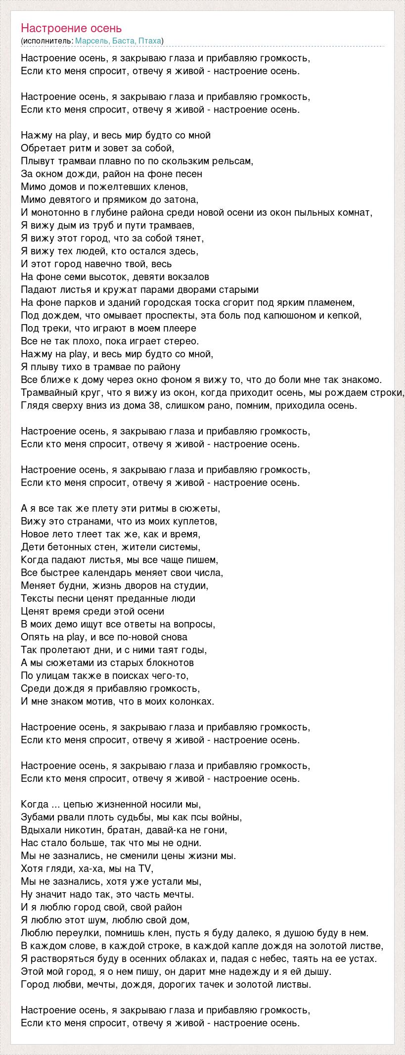 Настроение осень, я закрываю глаза и прибавляю громкость, Если кто меня спросит, отвечу я живой - настроение осень. Настроение осень, я закрываю глаза и прибавляю громкость, Если кто меня спросит, отвечу я живой - настроение осень. Нажму на play, и весь мир будто со мной Обретает ритм и зовет за собой, Плывут трамваи плавно по по скользким рельсам, За окном дожди, район на фоне песен Мимо домов и пожелтевших кленов, Мимо девятого и прямиком до затона, И монотонно в глубине района среди новой осени из окон пыльных комнат, Я вижу дым из труб и пути трамваев, Я вижу этот город, что за собой тянет, Я вижу тех людей, кто остался здесь, И этот город навечно твой, весь На фоне семи высоток, девяти вокзалов Падают листья и кружат парами дворами старыми На фоне парков и зданий городская тоска сгорит под ярким пламенем, Под дождем, что омывает проспекты, эта боль под капюшоном и кепкой, Под треки, что играют в моем плеере Все не так плохо, пока играет стерео. Нажму на play, и весь мир будто со мной, Я плыву тихо в трамвае по району Все ближе к дому через окно фоном я вижу то, что до боли мне так знакомо. Трамвайный круг, что я вижу из окон, когда приходит осень, мы рождаем строки, Глядя сверху вниз из дома 38, слишком рано, помним, приходила осень. Настроение осень, я закрываю глаза и прибавляю громкость, Если кто меня спросит, отвечу я живой - настроение осень. Настроение осень, я закрываю глаза и прибавляю громкость, Если кто меня спросит, отвечу я живой - настроение осень. А я все так же плету эти ритмы в сюжеты, Вижу это странами, что из моих куплетов, Новое лето тлеет так же, как и время, Дети бетонных стен, жители системы, Когда падают листья, мы все чаще пишем, Все быстрее календарь меняет свои числа, Меняет будни, жизнь дворов на студии, Тексты песни ценят преданные люди Ценят время среди этой осени В моих демо ищут все ответы на вопросы, Опять на play, и все по-новой снова Так пролетают дни, и с ними таят годы, А мы сюжетами из старых блокнотов По улицам также в поисках чего-то, Среди дождя я прибавляю громкость, И мне знаком мотив, что в моих колонках. Настроение осень, я закрываю глаза и прибавляю громкость, Если кто меня спросит, отвечу я живой - настроение осень. Настроение осень, я закрываю глаза и прибавляю громкость, Если кто меня спросит, отвечу я живой - настроение осень. Когда ... цепью жизненной носили мы, Зубами рвали плоть судьбы, мы как псы войны, Вдыхали никотин, братан, давай-ка не гони, Нас стало больше, так что мы не одни. Мы не зазнались, не сменили цены жизни мы. Хотя гляди, ха-ха, мы на TV, Мы не зазнались, хотя уже устали мы, Ну значит надо так, это часть мечты. И я люблю город свой, свой район Я люблю этот шум, люблю свой дом, Люблю переулки, помнишь клен, пусть я буду далеко, я душою буду в нем. В каждом слове, в каждой строке, в каждой капле дождя на золотой листве, Я растворяться буду в осенних облаках и, падая с небес, таять на ее устах. Этой мой город, я о нем пишу, он дарит мне надежду и я ей дышу. Город любви, мечты, дождя, дорогих тачек и золотой листвы. Настроение осень, я закрываю глаза и прибавляю громкость, Если кто меня спросит, отвечу я живой - настроение осень.