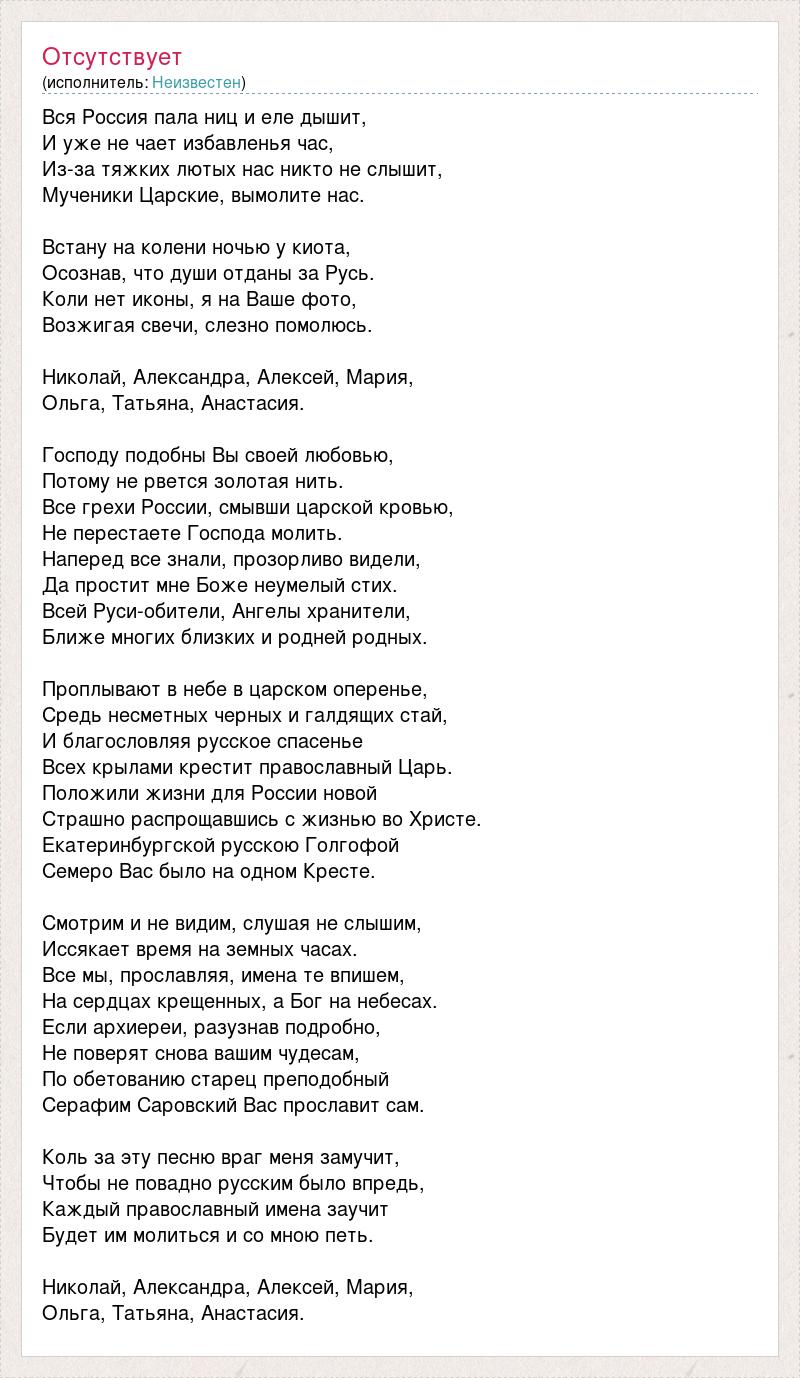 Вся Россия пала ниц и еле дышит, И уже не чает избавленья час, Из-за тяжких лютых нас никто не слышит, Мученики Царские, вымолите нас. Встану на колени ночью у киота, Осознав, что души отданы за Русь. Коли нет иконы, я на Ваше фото, Возжигая свечи, слезно помолюсь. Николай, Александра, Алексей, Мария, Ольга, Татьяна, Анастасия. Господу подобны Вы своей любовью, Потому не рвется золотая нить. Все грехи России, смывши царской кровью, Не перестаете Господа молить. Наперед все знали, прозорливо видели, Да простит мне Боже неумелый стих. Всей Руси-обители, Ангелы хранители, Ближе многих близких и родней родных. Проплывают в небе в царском оперенье, Средь несметных черных и галдящих стай, И благословляя русское спасенье Всех крылами крестит православный Царь. Положили жизни для России новой Страшно распрощавшись с жизнью во Христе. Екатеринбургской русскою Голгофой Семеро Вас было на одном Кресте. Смотрим и не видим, слушая не слышим, Иссякает время на земных часах. Все мы, прославляя, имена те впишем, На сердцах крещенных, а Бог на небесах. Если архиереи, разузнав подробно, Не поверят снова вашим чудесам, По обетованию старец преподобный Серафим Саровский Вас прославит сам. Коль за эту песню враг меня замучит, Чтобы не повадно русским было впредь, Каждый православный имена заучит Будет им молиться и со мною петь. Николай, Александра, Алексей, Мария, Ольга, Татьяна, Анастасия.