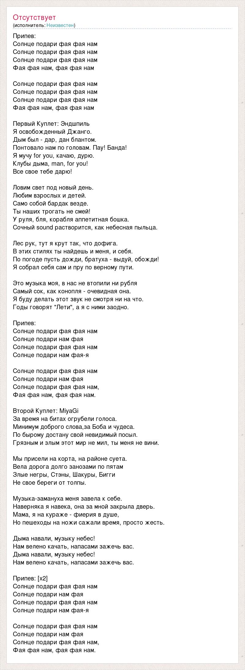 Припев: Солнце подари фая фая нам Солнце подари фая фая нам Солнце подари фая фая нам Фая фая нам, фая фая нам Солнце подари фая фая нам Солнце подари фая фая нам Солнце подари фая фая нам Фая фая нам, фая фая нам Первый Куплет: Эндшпиль Я освобожденный Джанго. Дым был - дар, дан блантом. Понтовало нам по головам. Пау! Банда! Я мучу for you, качаю, дурю. Клубы дыма, man, for you! Все свое тебе дарю! Ловим свет под новый день. Любим взрослых и детей. Само собой бардак везде. Ты наших трогать не смей! У руля, бля, корабля аппетитная бошка. Сочный sound растворится, как небесная пыльца. Лес рук, тут я крут так, что дофига. В этих стилях ты найдешь и меня, и себя. По погоде пусть дожди, братуха - выдуй, обожди! Я собрал себя сам и пру по верному пути. Это музыка моя, в нас не втопили ни рубля Самый сок, как конопля - очевидная она. Я буду делать этот звук не смотря ни на что. Годы говорят "Лети", а я с ними заодно. Припев: Солнце подари фая фая нам Солнце подари нам фая Солнце подари фая фая нам Солнце подари нам фая-я Солнце подари фая фая нам Солнце подари нам фая Солнце подари фая фая нам, Фая фая нам, фая фая нам. Второй Куплет: MiyaGi За время на битах огрубели голоса. Минимум доброго слова,за Боба и чудеса. По бырому достану свой невидимый посыл. Грязным и злым этот мир не мил, ты меня не вини. Мы присели на корта, на районе суета. Вела дорога долго занозами по пятам Злые негры, Стэны, Шакуры, Бигги Не свое береги от толпы. Музыка-замануха меня завела к себе. Наверняка я навека, она за мной закрыла дверь. Мама, я на кураже - фиерия в душе, Но пешеходы на ножи сажали время, просто жесть. Дыма навали, музыку небес! Нам велено качать, напасами зажечь вас. Дыма навали, музыку небес! Нам велено качать, напасами зажечь вас. Припев: [х2] Солнце подари фая фая нам Солнце подари нам фая Солнце подари фая фая нам Солнце подари нам фая-я Солнце подари фая фая нам Солнце подари нам фая Солнце подари фая фая нам, Фая фая нам, фая фая нам.
