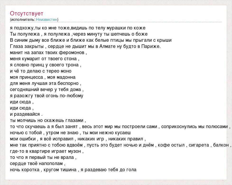 я подхожу,ты ко мне тоже,видишь по телу мурашки по коже Ты полулежа , я полулежа ,через минуту ты шепчешь о боже В синим дыму все ближе и ближе как белые птицы мы прыгали с крыши Глаза закрыты , сердце не дышит мы в Алмате ну будто в Париже. манит на запах твоих феромонов , меня кумарит от твоего стона , я словно принц у своего трона , и чё то делаю с терео моно моя принцесса , моя мадонна для меня лучшая эта беспорно , сегодняшний вечер у тебя дома , я разожгу твой огонь по-любому иди сюда , иди сюда , и раздевайся . ты молчишь но скажешь глазами , то что скучаешь а я был занят , весь этот мир мы построели сами , соприкоснулись мы полюсами , ночью с тобой , утром не знаю , ты мои нежно кусаеш мои ошибки , я всё исправил , никаких игр , никаких правил , мне так приятно с тобою вдвоём , пусть это будет ночью и днём , кофе остыл , сигарета , балкон , где-то в квартире играет музон , то что я первый ты не врала , сердце твоё напополам , ночь коротка , кругом тишина , я раздеваю тебя до гола