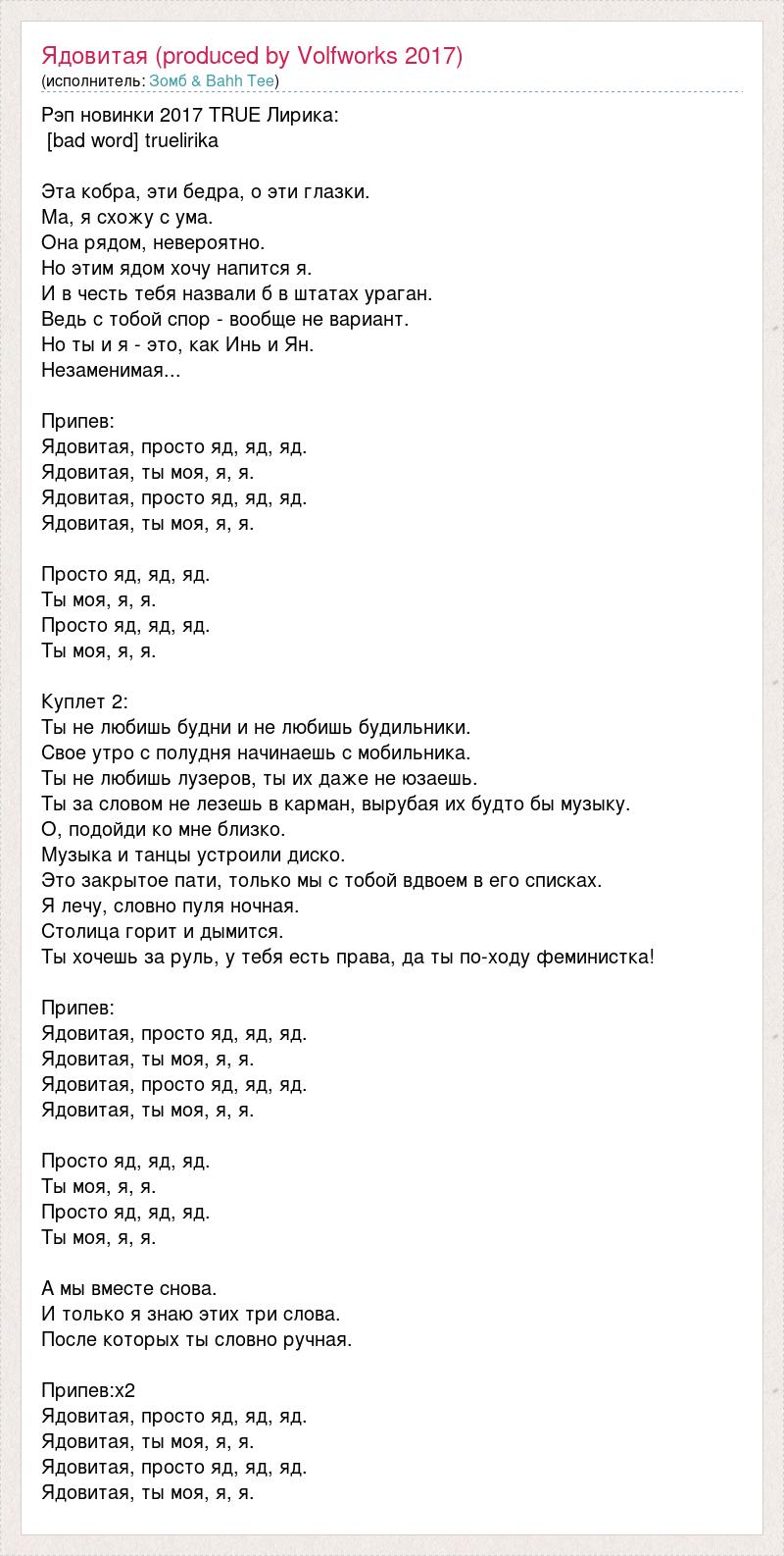 Рэп новинки 2017 TRUE Лирика: [bad word] truelirika Эта кобра, эти бедра, о эти глазки. Ма, я схожу с ума. Она рядом, невероятно. Но этим ядом хочу напится я. И в честь тебя назвали б в штатах ураган. Ведь с тобой спор - вообще не вариант. Но ты и я - это, как Инь и Ян. Незаменимая... Припев: Ядовитая, просто яд, яд, яд. Ядовитая, ты моя, я, я. Ядовитая, просто яд, яд, яд. Ядовитая, ты моя, я, я. Просто яд, яд, яд. Ты моя, я, я. Просто яд, яд, яд. Ты моя, я, я. Куплет 2: Ты не любишь будни и не любишь будильники. Свое утро с полудня начинаешь с мобильника. Ты не любишь лузеров, ты их даже не юзаешь. Ты за словом не лезешь в карман, вырубая их будто бы музыку. О, подойди ко мне близко. Музыка и танцы устроили диско. Это закрытое пати, только мы с тобой вдвоем в его списках. Я лечу, словно пуля ночная. Столица горит и дымится. Ты хочешь за руль, у тебя есть права, да ты по-ходу феминистка! Припев: Ядовитая, просто яд, яд, яд. Ядовитая, ты моя, я, я. Ядовитая, просто яд, яд, яд. Ядовитая, ты моя, я, я. Просто яд, яд, яд. Ты моя, я, я. Просто яд, яд, яд. Ты моя, я, я. А мы вместе снова. И только я знаю этих три слова. После которых ты словно ручная. Припев:х2 Ядовитая, просто яд, яд, яд. Ядовитая, ты моя, я, я. Ядовитая, просто яд, яд, яд. Ядовитая, ты моя, я, я.