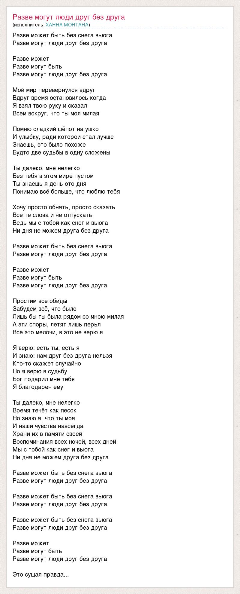 Разве может быть без снега вьюга Разве могут люди друг без друга Разве может Разве могут быть Разве могут люди друг без друга Мой мир перевернулся вдруг Вдруг время остановилось когда Я взял твою руку и сказал Всем вокруг, что ты моя милая Помню сладкий шёпот на ушко И улыбку, ради которой стал лучше Знаешь, это было похоже Будто две судьбы в одну сложены Ты далеко, мне нелегко Без тебя в этом мире пустом Ты знаешь я день ото дня Понимаю всё больше, что люблю тебя Хочу просто обнять, просто сказать Все те слова и не отпускать Ведь мы с тобой как снег и вьюга Ни дня не можем друга без друга Разве может быть без снега вьюга Разве могут люди друг без друга Разве может Разве могут быть Разве могут люди друг без друга Простим все обиды Забудем всё, что было Лишь бы ты была рядом со мною милая А эти споры, летят лишь перья Всё это мелочи, в это не верю я Я верю: есть ты, есть я И знаю: нам друг без друга нельзя Кто-то скажет случайно Но я верю в судьбу Бог подарил мне тебя Я благодарен ему Ты далеко, мне нелегко Время течёт как песок Но знаю я, что ты моя И наши чувства навсегда Храни их в памяти своей Воспоминания всех ночей, всех дней Мы с тобой как снег и вьюга Ни дня не можем друга без друга Разве может быть без снега вьюга Разве могут люди друг без друга Разве может быть без снега вьюга Разве могут люди друг без друга Разве может быть без снега вьюга Разве могут люди друг без друга Разве может Разве могут быть Разве могут люди друг без друга Это сущая правда...