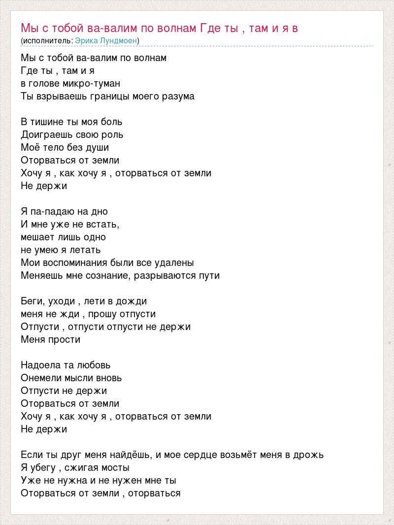 Мы с тобой ва-валим по волнам Где ты , там и я в голове микро-туман Ты взрываешь границы моего разума В тишине ты моя боль Доиграешь свою роль Моё тело без души Оторваться от земли Хочу я , как хочу я , оторваться от земли Не держи Я па-падаю на дно И мне уже не встать, мешает лишь одно не умею я летать Мои воспоминания были все удалены Меняешь мне сознание, разрываются пути Беги, уходи , лети в дожди меня не жди , прошу отпусти Отпусти , отпусти отпусти не держи Меня прости Надоела та любовь Онемели мысли вновь Отпусти не держи Оторваться от земли Хочу я , как хочу я , оторваться от земли Не держи Если ты друг меня найдёшь, и мое сердце возьмёт меня в дрожь Я убегу , сжигая мосты Уже не нужна и не нужен мне ты Оторваться от земли , оторваться