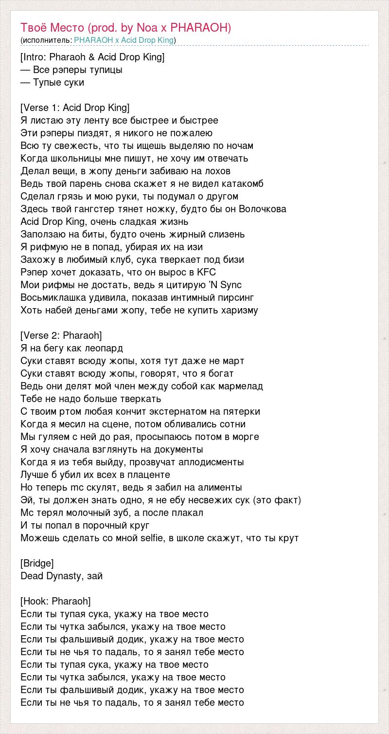 [Intro: Pharaoh & Acid Drop King] — Все рэперы тупицы — Тупые суки [Verse 1: Acid Drop King] Я листаю эту ленту все быстрее и быстрее Эти рэперы пиздят, я никого не пожалею Всю ту свежесть, что ты ищешь выделяю по ночам Когда школьницы мне пишут, не хочу им отвечать Делал вещи, в жопу деньги забиваю на лохов Ведь твой парень снова скажет я не видел катакомб Сделал грязь и мою руки, ты подумал о другом Здесь твой гангстер тянет ножку, будто бы он Волочкова Acid Drop King, очень сладкая жизнь Заползаю на биты, будто очень жирный слизень Я рифмую не в попад, убирая их на изи Захожу в любимый клуб, сука тверкает под бизи Рэпер хочет доказать, что он вырос в KFC Мои рифмы не достать, ведь я цитирую ’N Sync Восьмиклашка удивила, показав интимный пирсинг Хоть набей деньгами жопу, тебе не купить харизму [Verse 2: Pharaoh] Я на бегу как леопард Суки ставят всюду жопы, хотя тут даже не март Суки ставят всюду жопы, говорят, что я богат Ведь они делят мой член между собой как мармелад Тебе не надо больше тверкать С твоим ртом любая кончит экстернатом на пятерки Когда я месил на сцене, потом обливались сотни Мы гуляем с ней до рая, просыпаюсь потом в морге Я хочу сначала взглянуть на документы Когда я из тебя выйду, прозвучат аплодисменты Лучше б убил их всех в плаценте Но теперь mc скулят, ведь я забил на алименты Эй, ты должен знать одно, я не ебу несвежих сук (это факт) Mc терял молочный зуб, а после плакал И ты попал в порочный круг Можешь сделать со мной selfie, в школе скажут, что ты крут [Bridge] Dead Dynasty, зай [Hook: Pharaoh] Если ты тупая сука, укажу на твое место Если ты чутка забылся, укажу на твое место Если ты фальшивый додик, укажу на твое место Если ты не чья то падаль, то я занял тебе место Если ты тупая сука, укажу на твое место Если ты чутка забылся, укажу на твое место Если ты фальшивый додик, укажу на твое место Если ты не чья то падаль, то я занял тебе место
