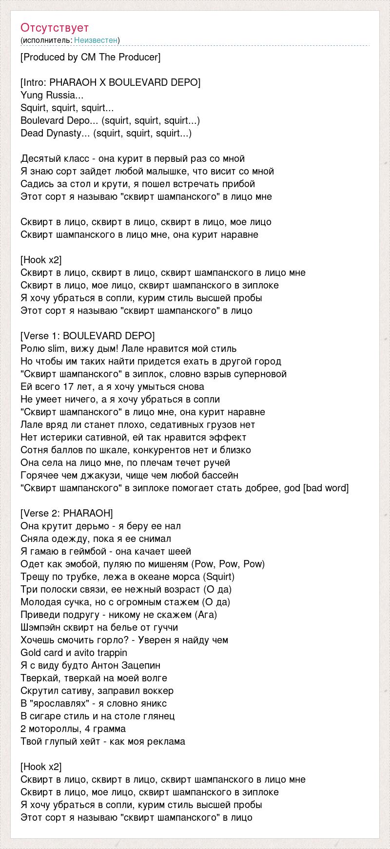 [Produced by CM The Producer] [Intro: PHARAOH X BOULEVARD DEPO] Yung Russia... Squirt, squirt, squirt... Boulevard Depo... (squirt, squirt, squirt...) Dead Dynasty... (squirt, squirt, squirt...) Десятый класс - она курит в первый раз со мной Я знаю сорт зайдет любой малышке, что висит со мной Садись за стол и крути, я пошел встречать прибой Этот сорт я называю "сквирт шампанского" в лицо мне Сквирт в лицо, сквирт в лицо, сквирт в лицо, мое лицо Сквирт шампанского в лицо мне, она курит наравне [Hook x2] Сквирт в лицо, сквирт в лицо, сквирт шампанского в лицо мне Сквирт в лицо, мое лицо, сквирт шампанского в зиплоке Я хочу убраться в сопли, курим стиль высшей пробы Этот сорт я называю "сквирт шампанского" в лицо [Verse 1: BOULEVARD DEPO] Ролю slim, вижу дым! Лале нравится мой стиль Но чтобы им таких найти придется ехать в другой город "Сквирт шампанского" в зиплок, словно взрыв суперновой Ей всего 17 лет, а я хочу умыться снова Не умеет ничего, а я хочу убраться в сопли "Сквирт шампанского" в лицо мне, она курит наравне Лале вряд ли станет плохо, седативных грузов нет Нет истерики сативной, ей так нравится эффект Сотня баллов по шкале, конкурентов нет и близко Она села на лицо мне, по плечам течет ручей Горячее чем джакузи, чище чем любой бассейн "Сквирт шампанского" в зиплоке помогает стать добрее, god [bad word] [Verse 2: PHARAOH] Она крутит дерьмо - я беру ее нал Сняла одежду, пока я ее снимал Я гамаю в геймбой - она качает шеей Одет как эмобой, пуляю по мишеням (Pow, Pow, Pow) Трещу по трубке, лежа в океане морса (Squirt) Три полоски связи, ее нежный возраст (О да) Молодая сучка, но с огромным стажем (О да) Приведи подругу - никому не скажем (Ага) Шэмпэйн сквирт на белье от гуччи Хочешь смочить горло? - Уверен я найду чем Gold card и avito trappin Я с виду будто Антон Зацепин Тверкай, тверкай на моей волге Скрутил сативу, заправил воккер В "ярославлях" - я словно яникс В сигаре стиль и на столе глянец 2 мотороллы, 4 грамма Твой глупый хейт - как моя реклама [Hook x2] Сквирт в лицо, сквирт в лицо, сквирт шампанского в лицо мне Сквирт в лицо, мое лицо, сквирт шампанского в зиплоке Я хочу убраться в сопли, курим стиль высшей пробы Этот сорт я называю "сквирт шампанского" в лицо